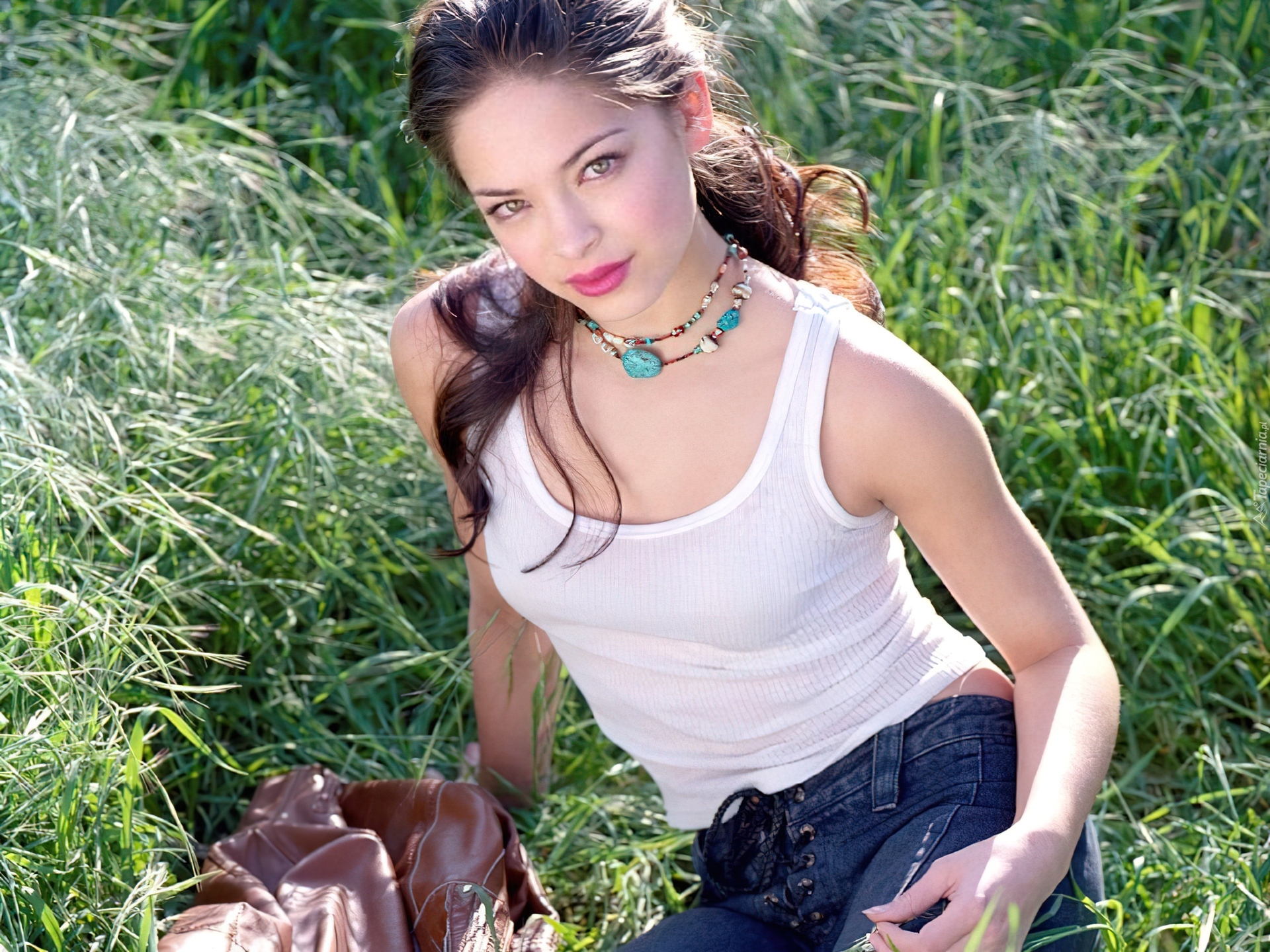 Edytor tapety: Kristin Kreuk, Trawa, Kurtka