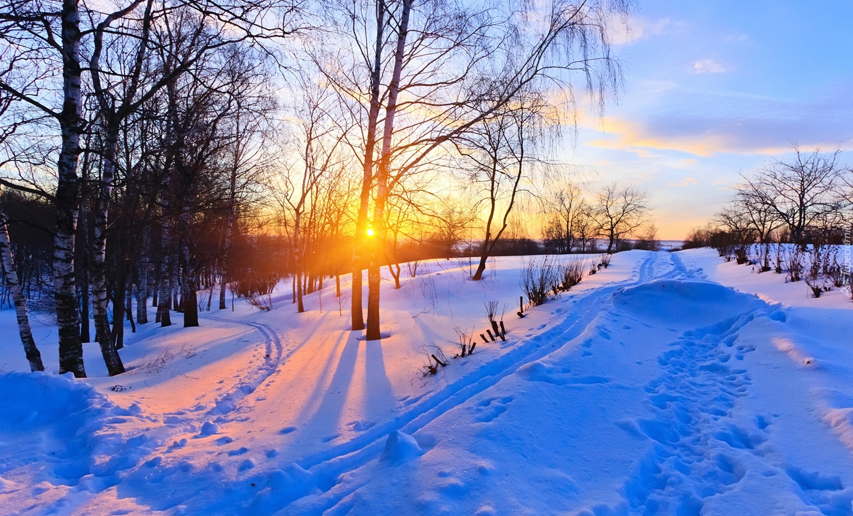 Edytor tapety: Zima, Wschód, Słońca, Drzewa, Droga