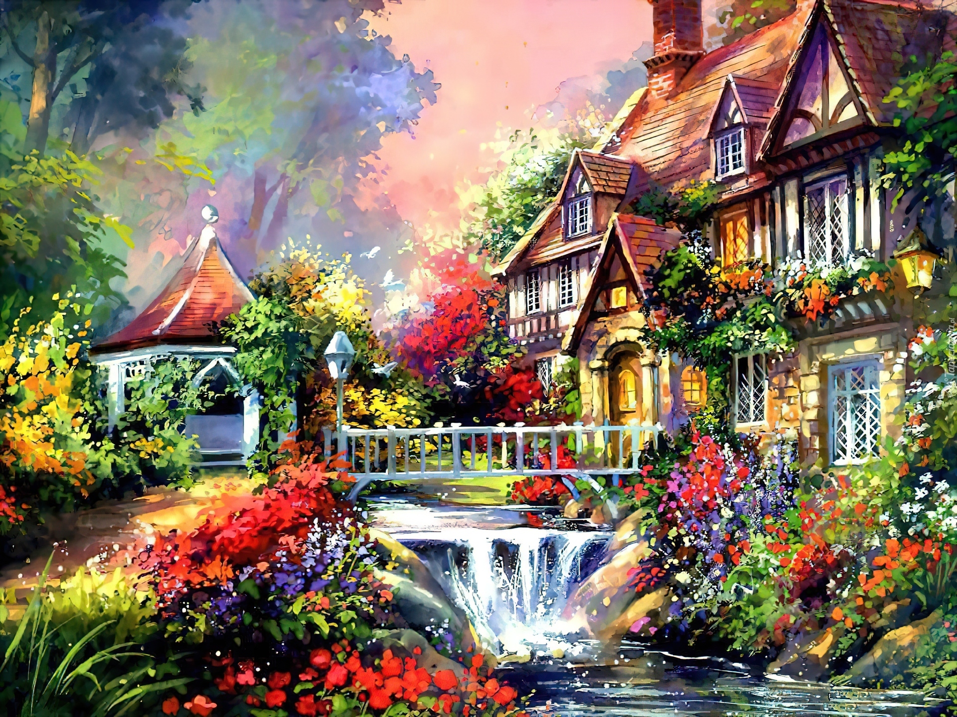 Edytor tapety: Dom, Mostek, Altana, Kwiaty
