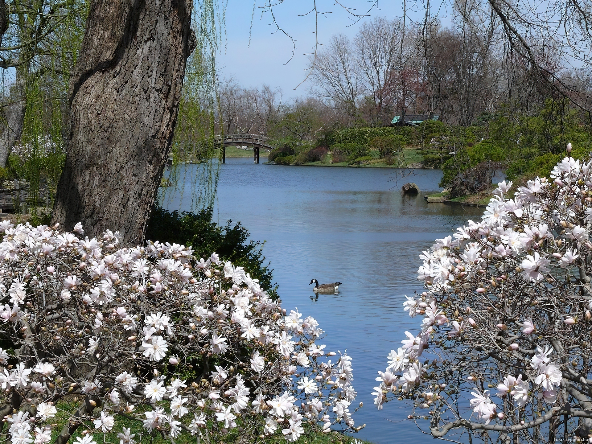 Edytor tapety: Rzeka, Most, Kwiaty, Kaczka