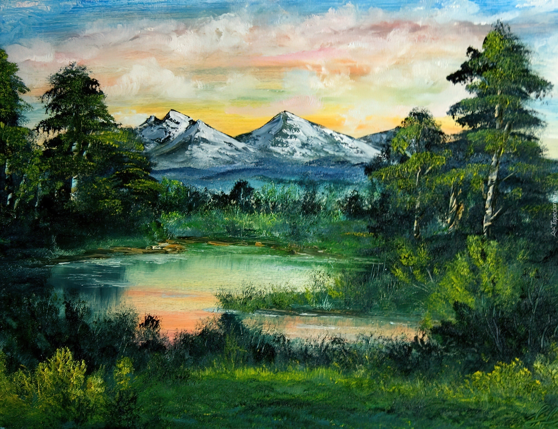 Edytor tapety: Jeziorko, Drzewa, Góry, Chmury