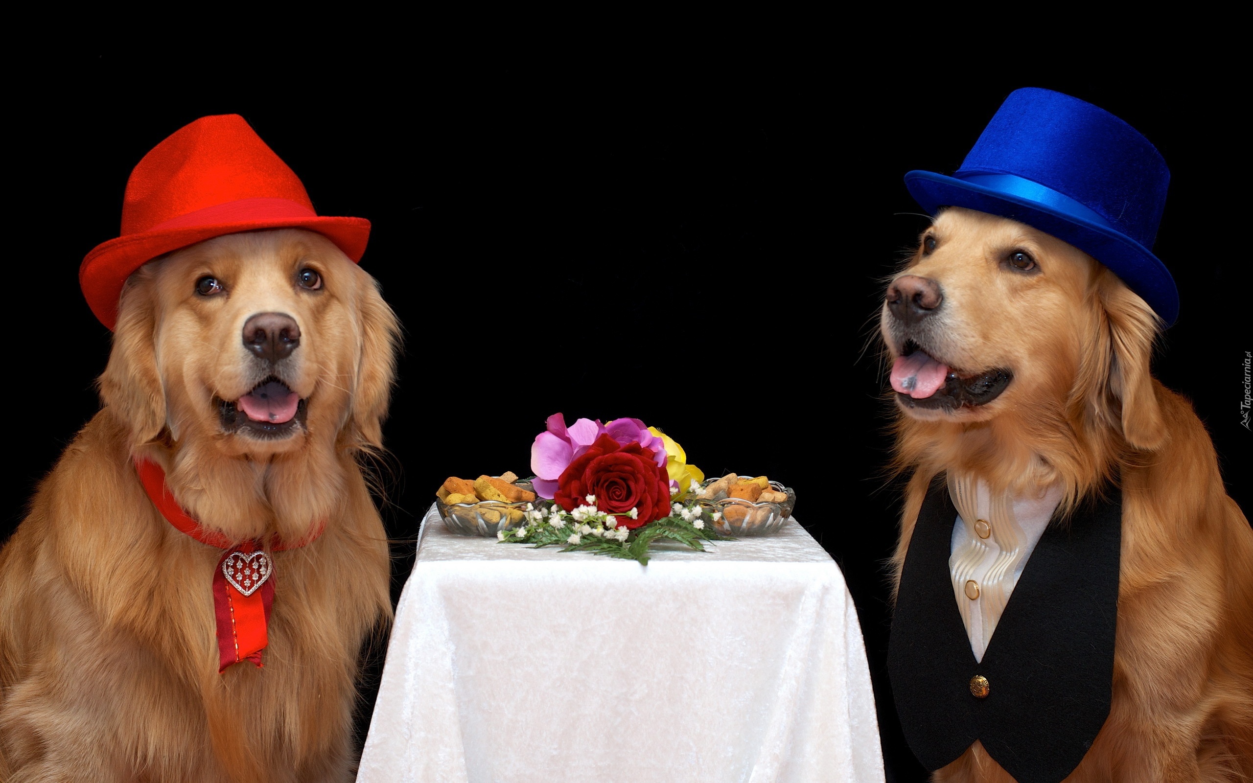 Edytor tapety: Dwa, Psy, Golden retriever, Kapelusze