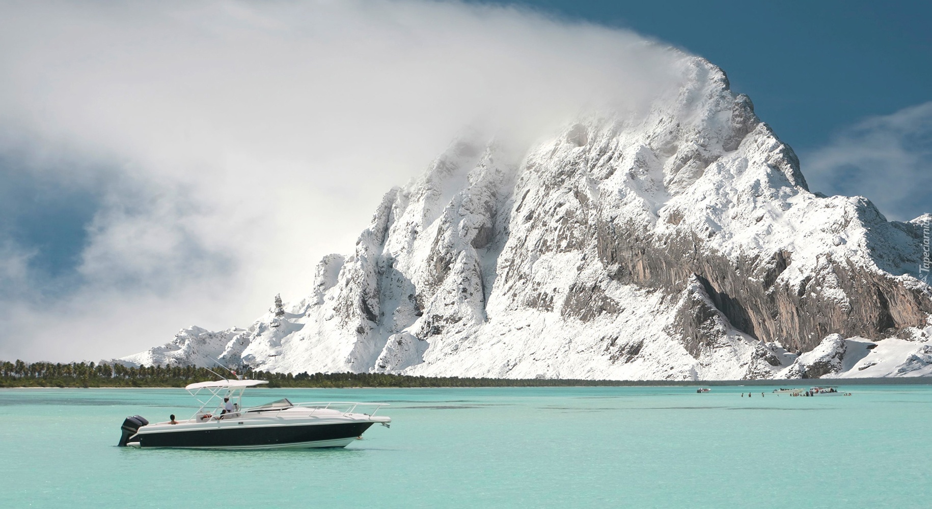 Edytor tapety: Góry, Śnieg, Morze, Motorówka