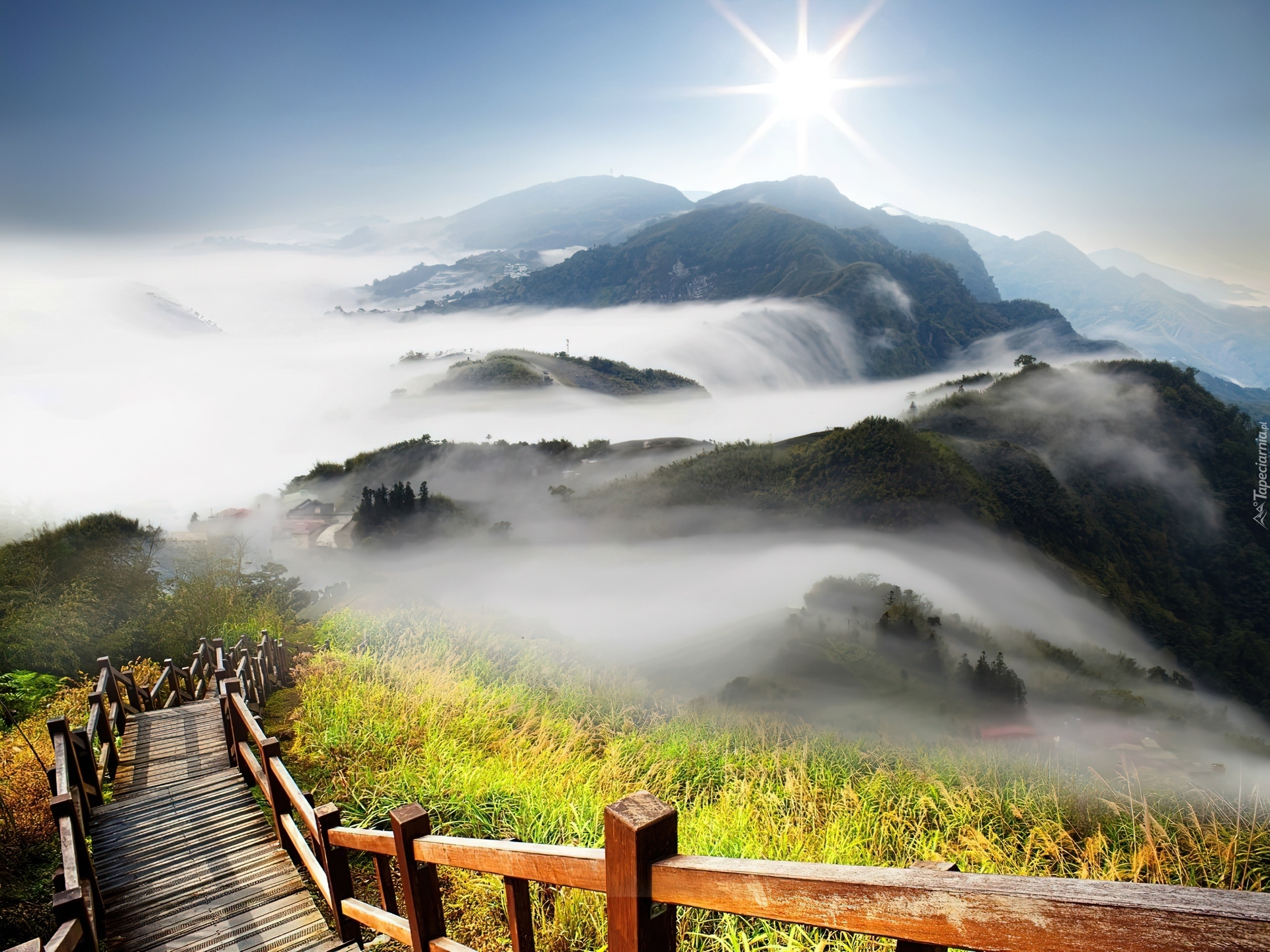 Edytor tapety: Góry, Mgła, Promienie, Słoneczne, Schody