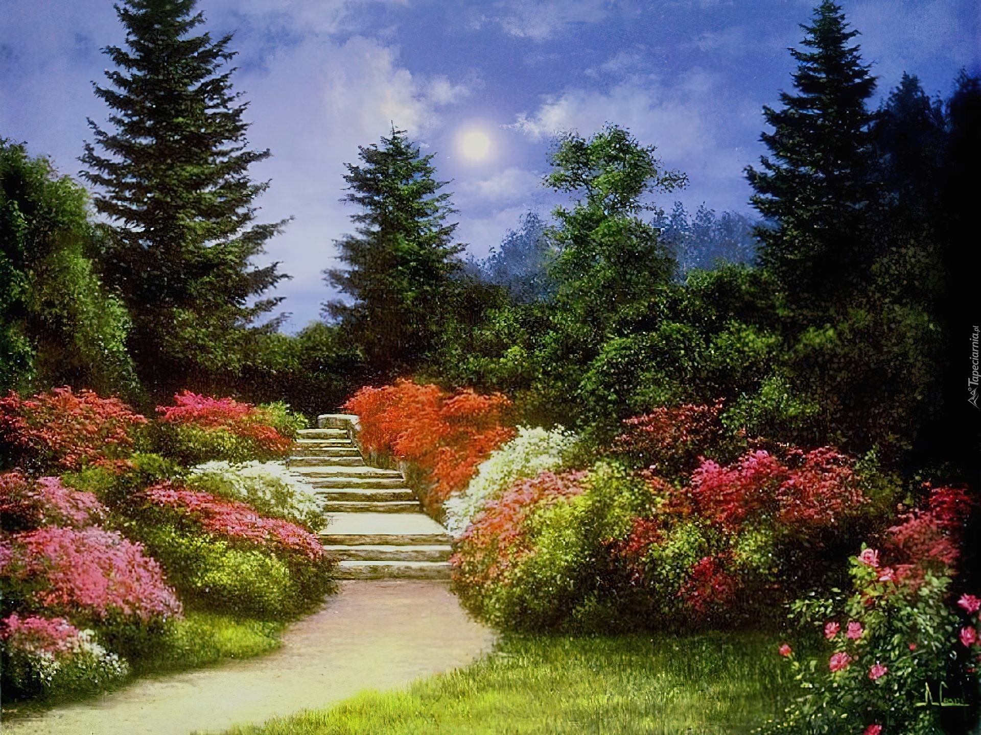 Edytor tapety: Obraz, Thomas Kinkade, Park, Kwiaty, Lato