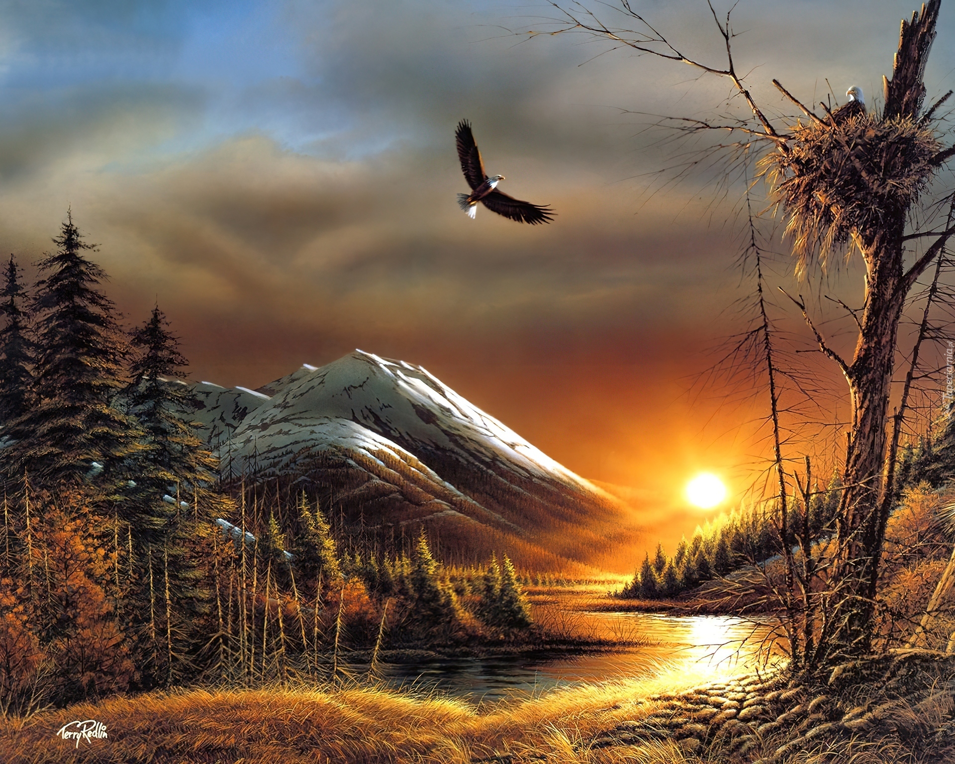 Edytor tapety: Góry, Zachód słońca, Ptaki, Terry Avon Redlin