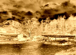 Edytor tapety: Rzeka, Góry, Drzewa, Chmury
