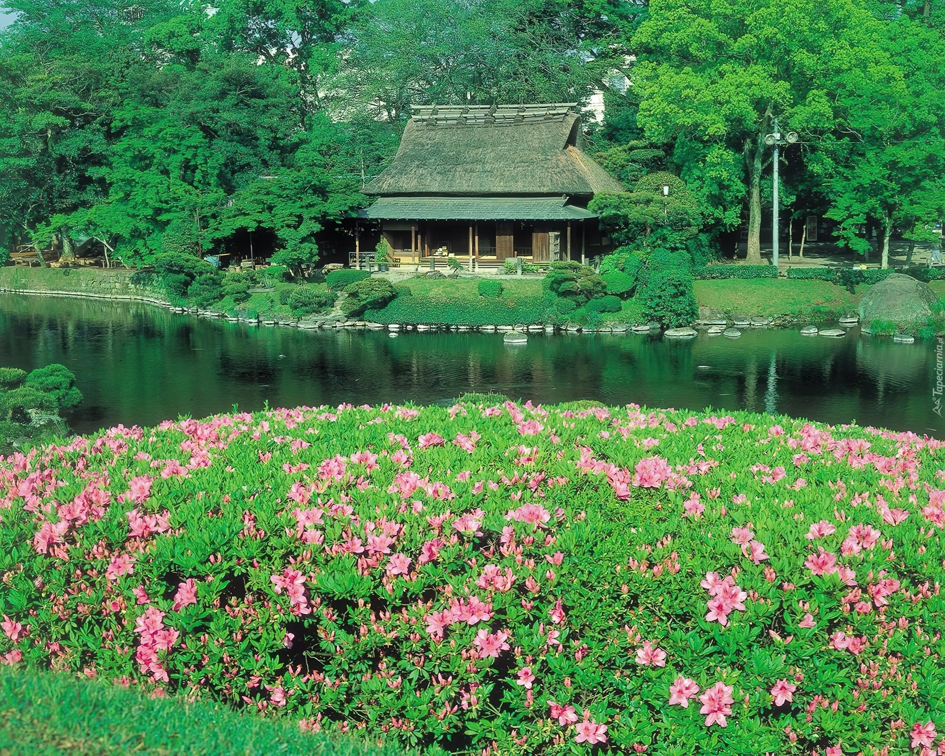 Edytor tapety: Dom, Ogród, Rzeka, Kwiatki
