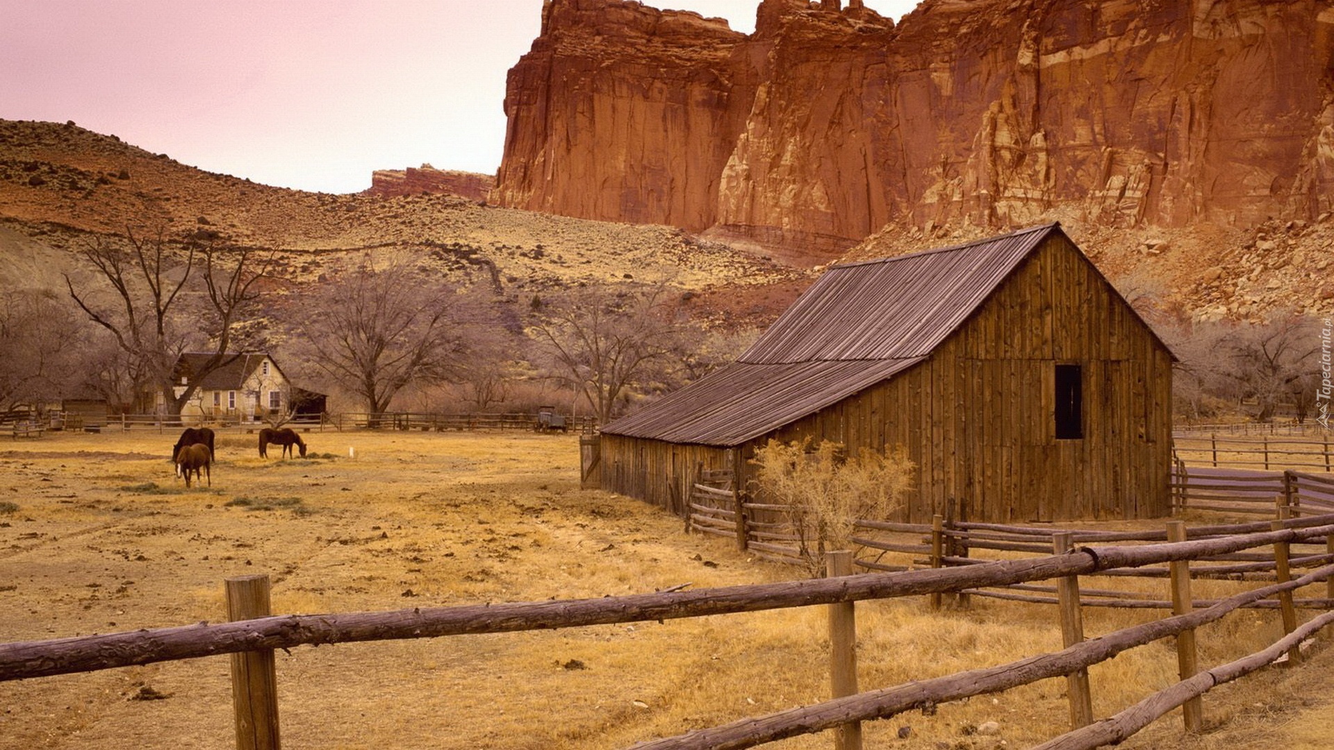 Edytor tapety: Szopa, Skały, Zagroda, Konie