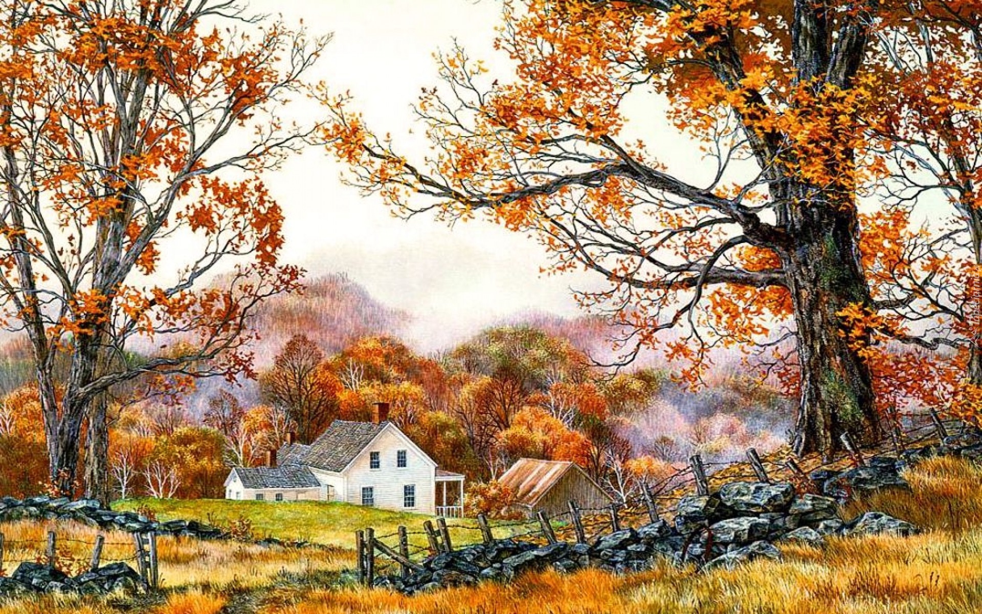 Edytor tapety: Łąka, Dom, Murek, Płot, Drzewa, Jesień