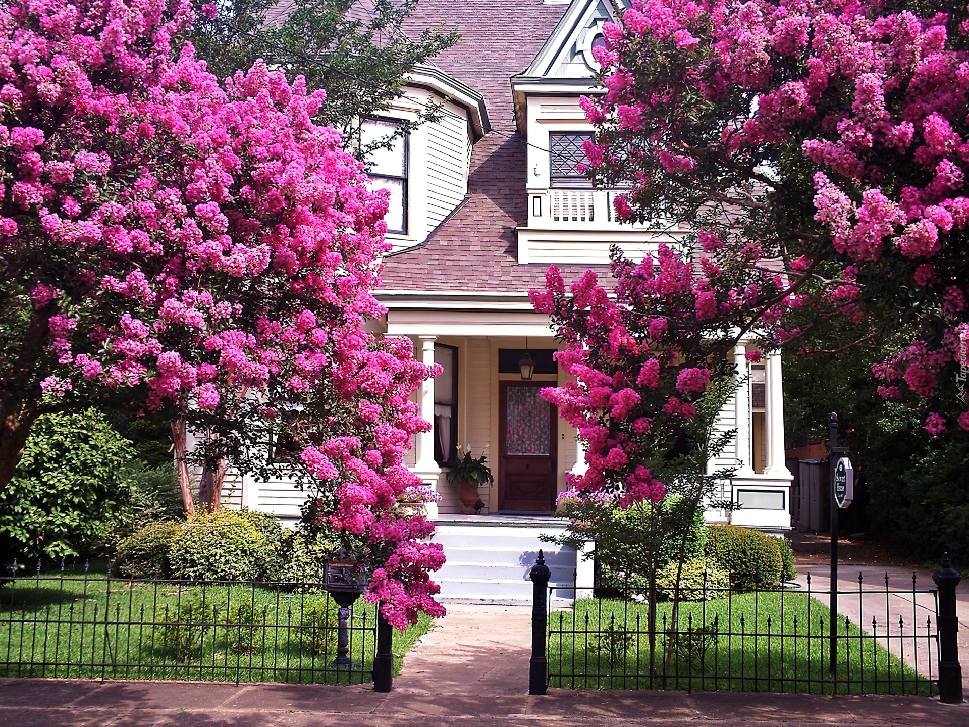 Edytor tapety: Dom, Willa, Kwitnące, Drzewa, Płot, Trawnik