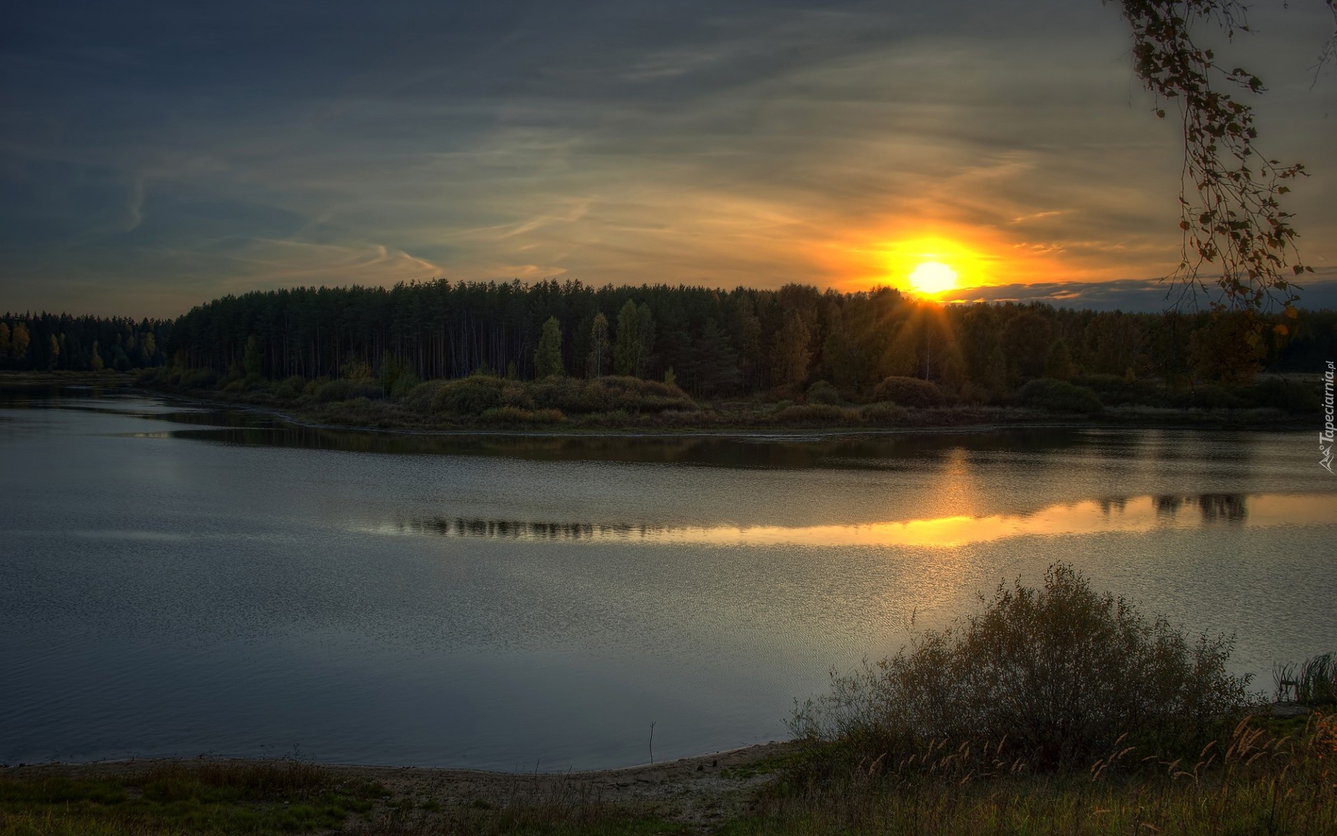 Edytor tapety: Jezioro, Lasy, Promienie, Słońca