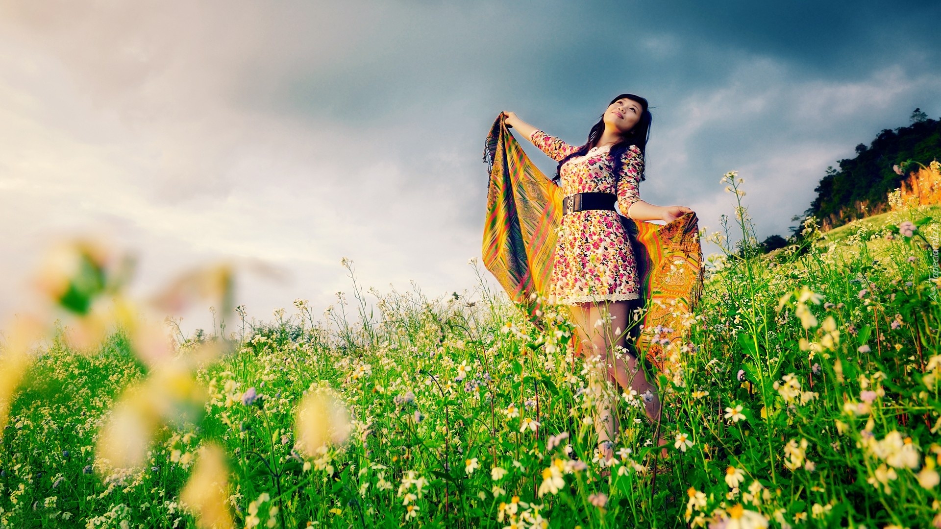 Edytor tapety: Kobieta, Sukienka, Chusta, Polne, Kwiaty