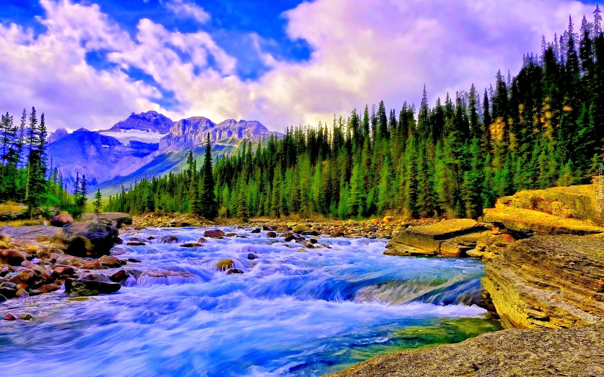 Edytor tapety: Góry, Chmury, Rzeka, Choinki