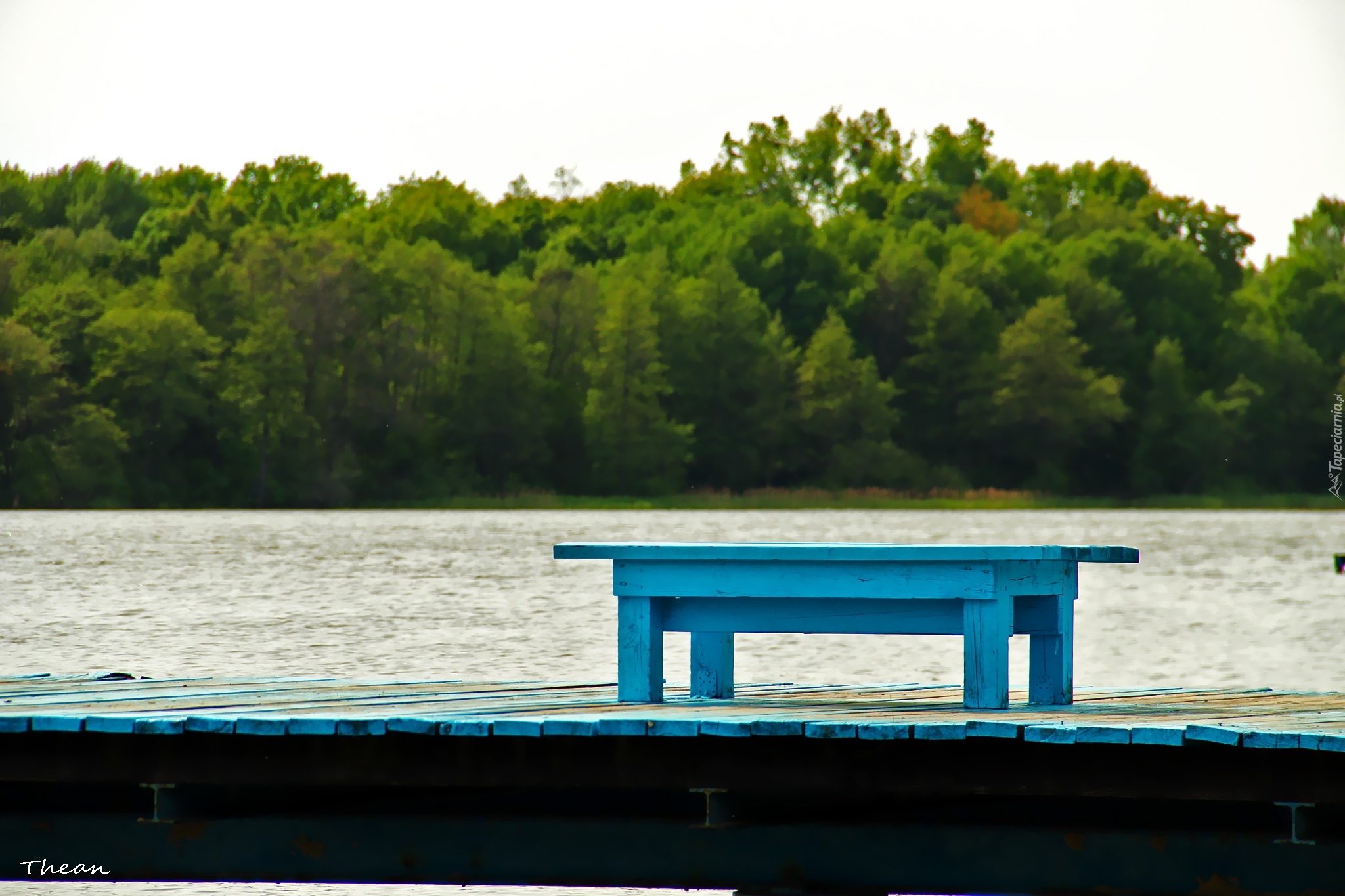 Edytor tapety: Pomost, Jezioro, Niebieska, Ławka