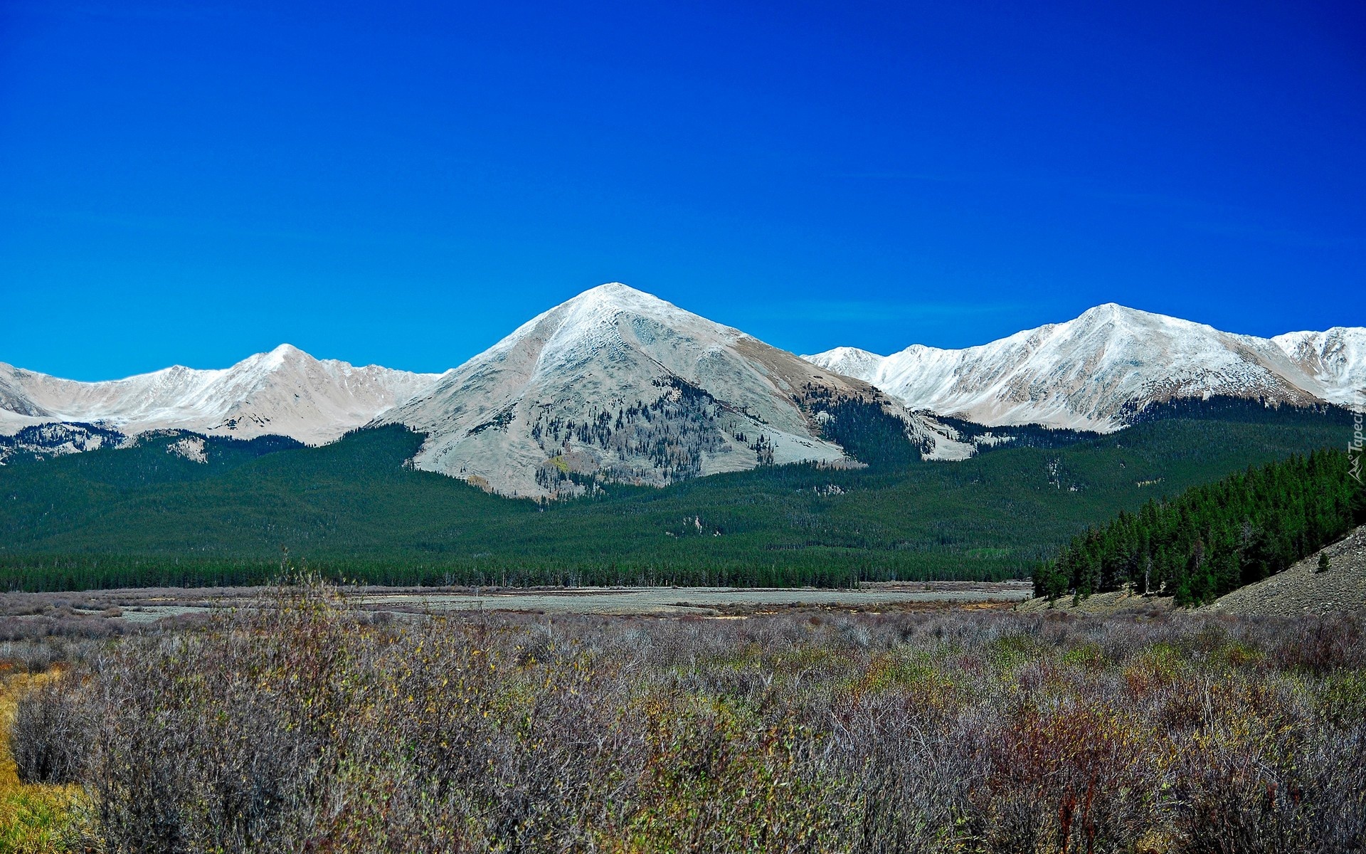 Edytor tapety: Góry, Ośnieżone, Szczyty, Lasy, Rzeka