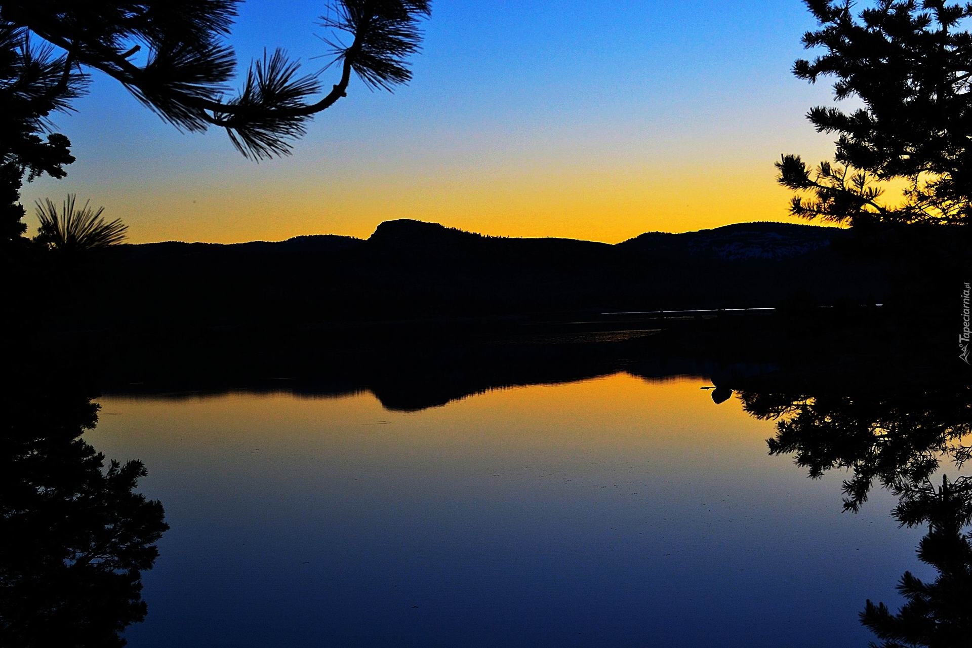 Edytor tapety: Jezioro, Góry, Gałęzie, Zachód Słońca, Loon, Kalifornia