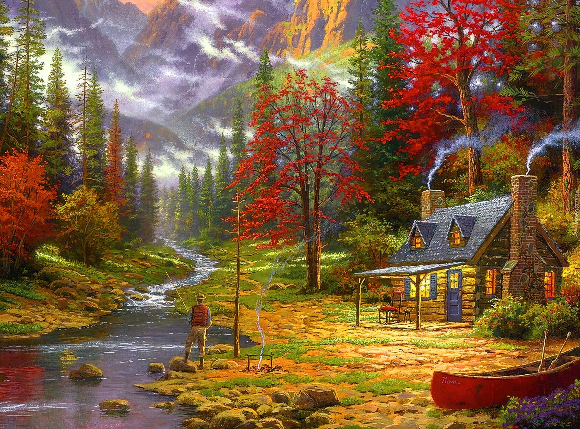 Edytor tapety: Domek, Rzeka, Strumyk, Wędkarz, Góry