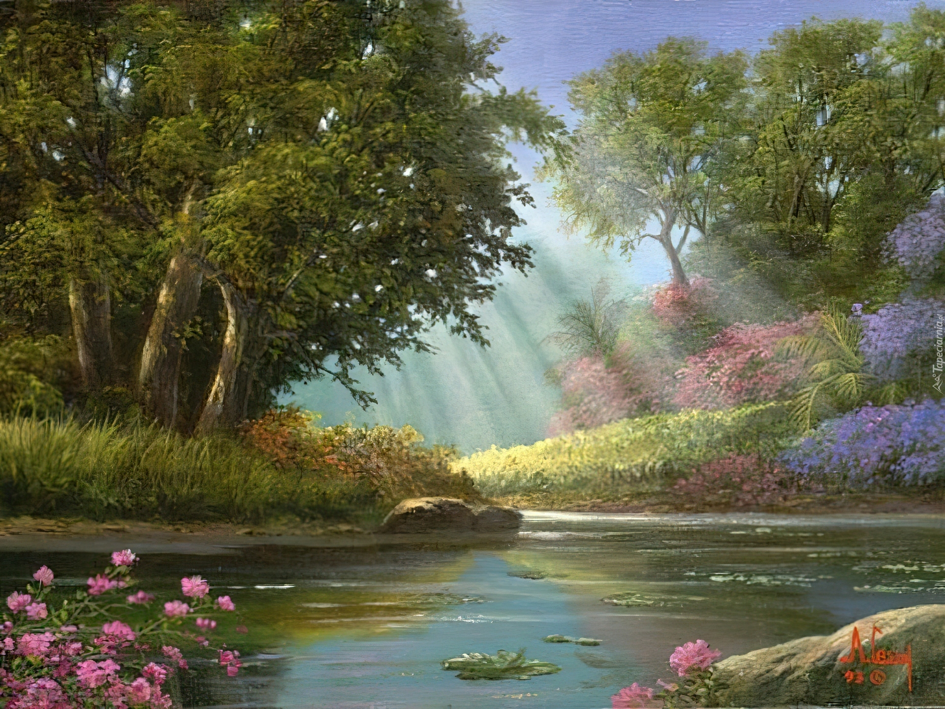 Edytor tapety: Rzeka, Drzewa, Promienie, Słońca