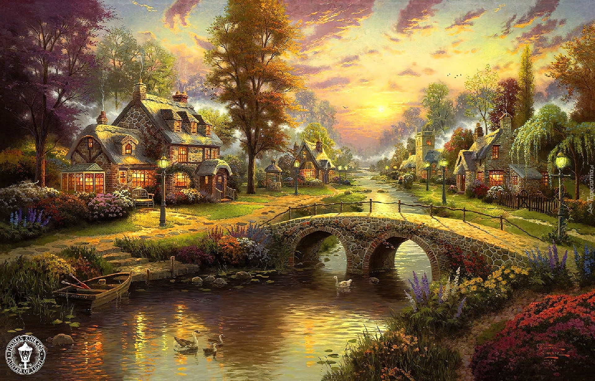 Edytor tapety: Rzeka, Most, Domy, Thomas Kinkade, Reprodukcja obrazu