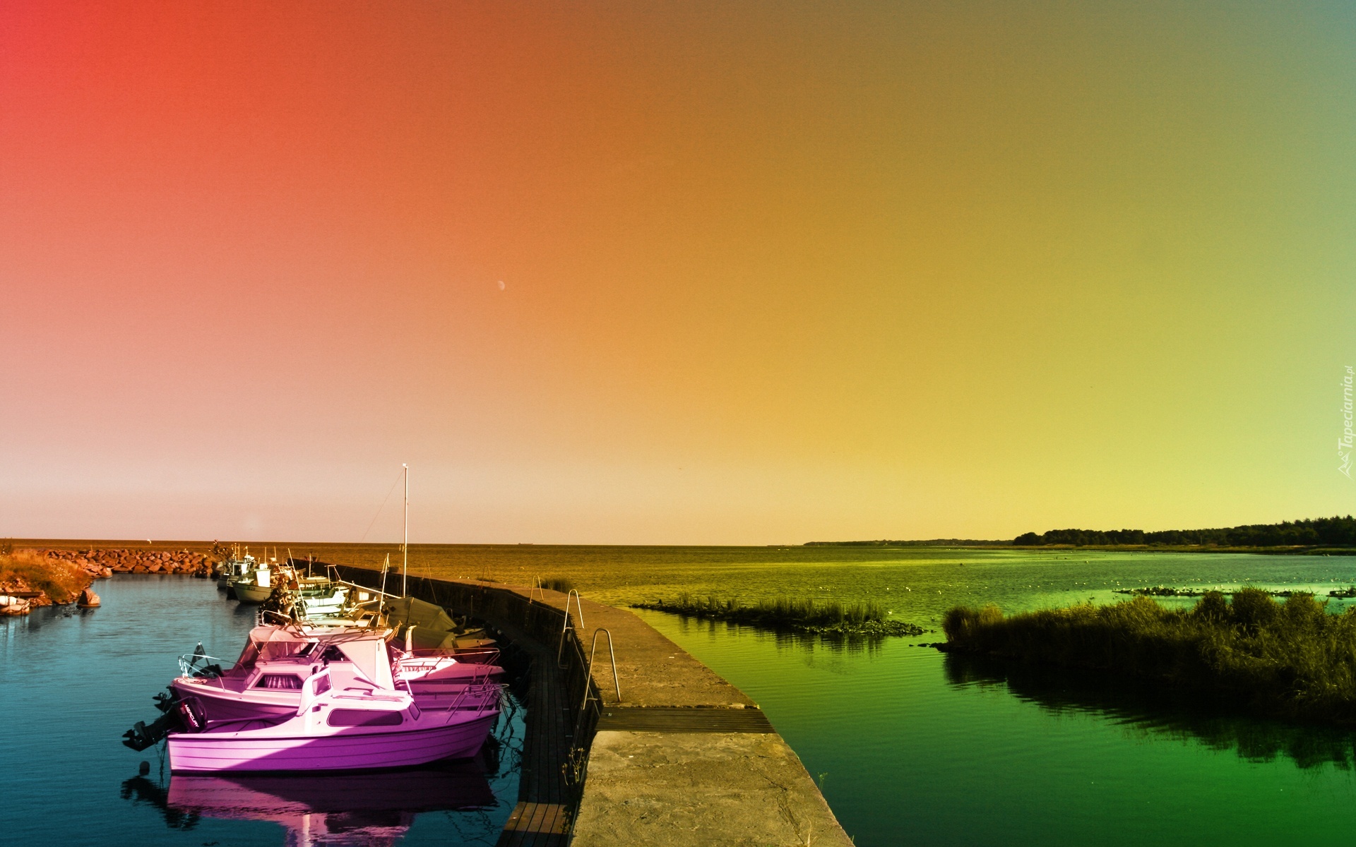 Edytor tapety: Przystań, Motorówki, Zachód, Słońca, Jezioro