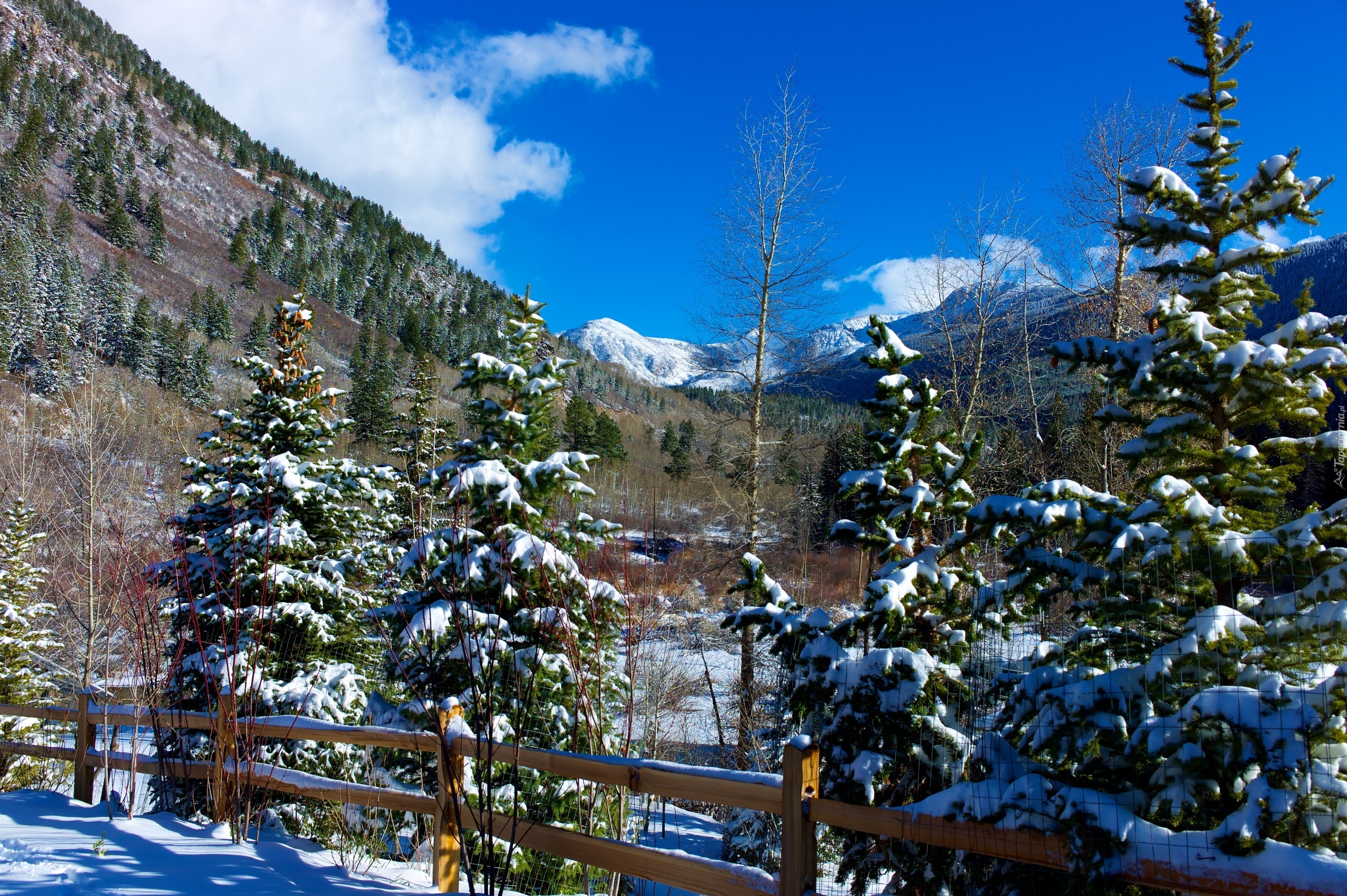 Edytor tapety: Zima, Płotek, Drzewa, Góry