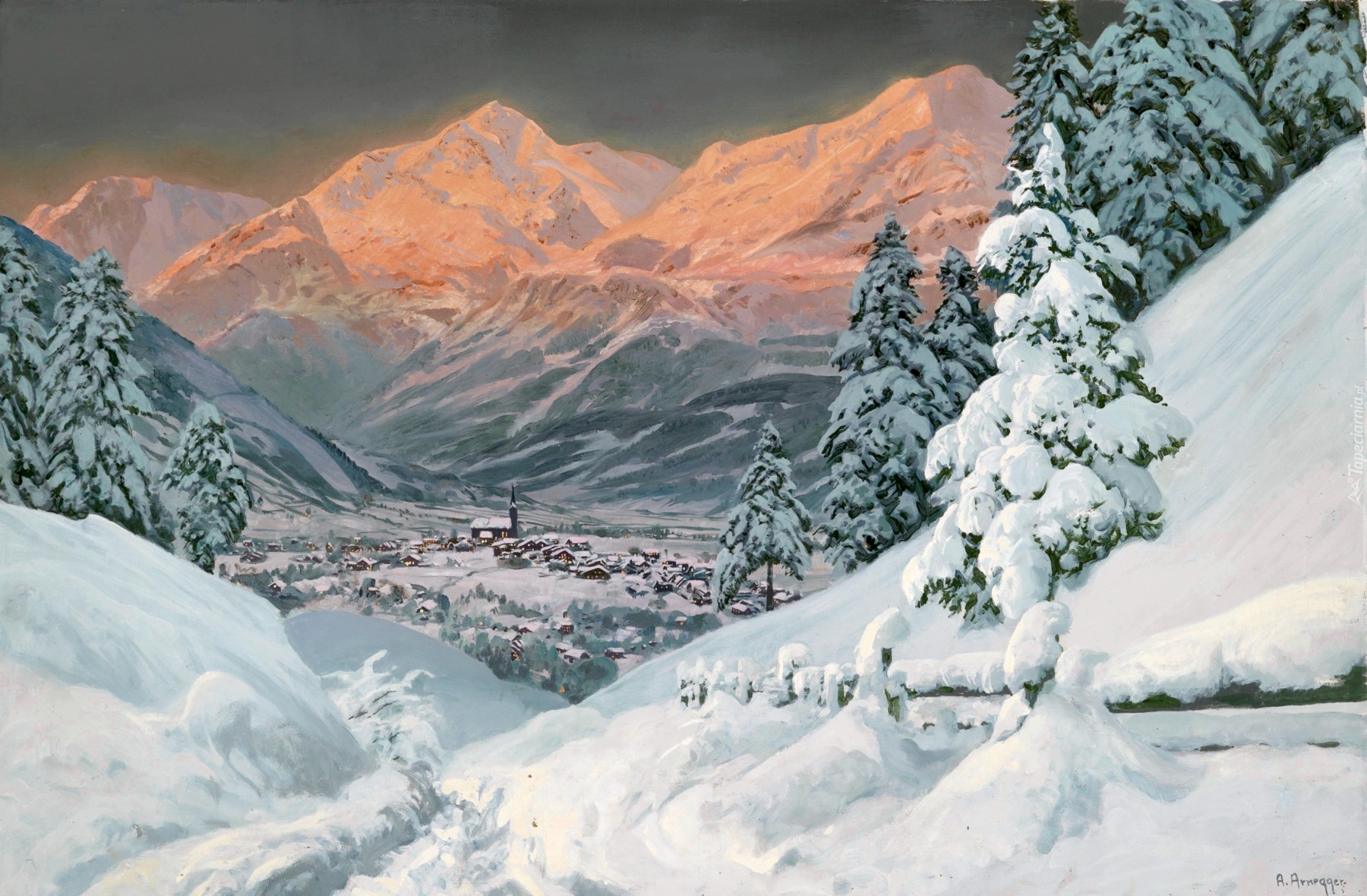 Edytor tapety: Góry, Zimowy, Widoczek, Zima Malarstwo, Obraz, Alois Arnegger