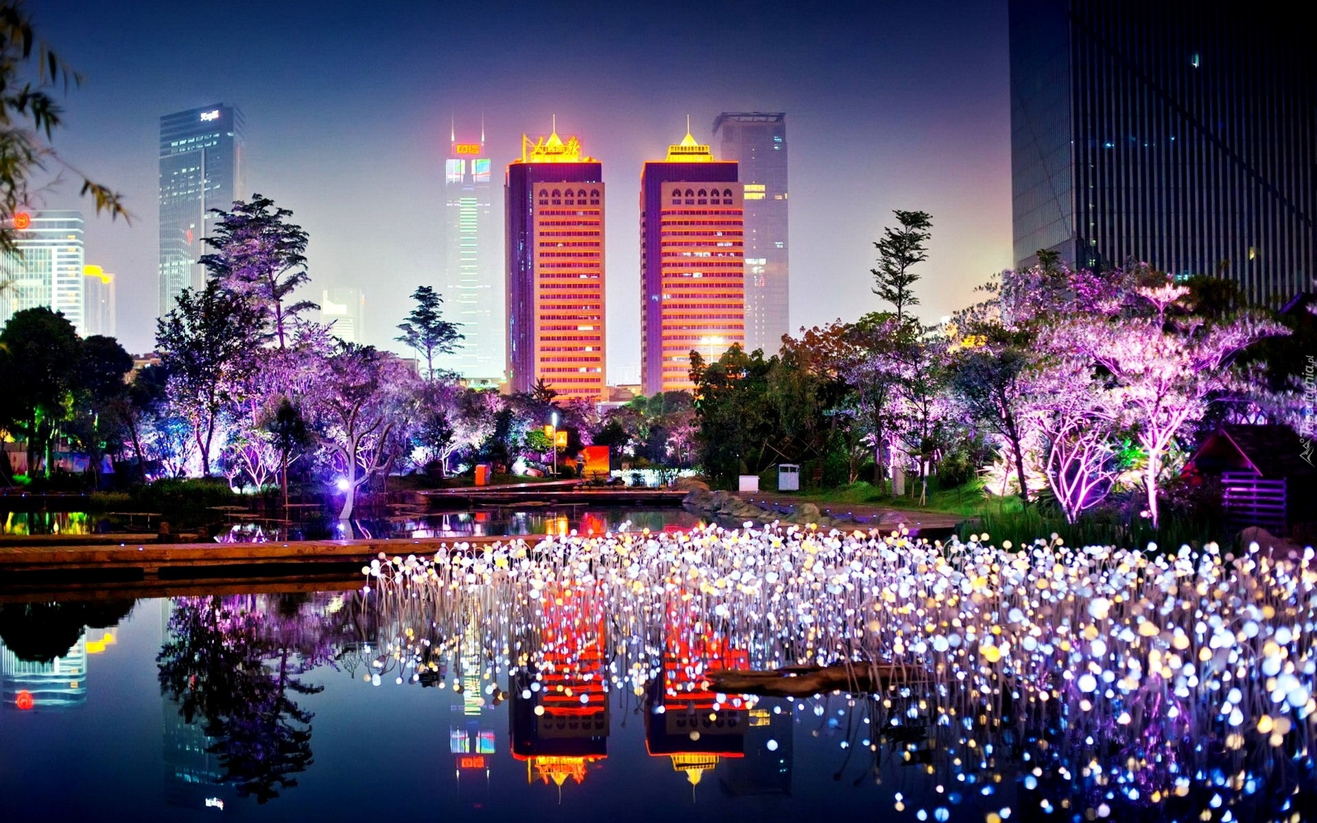 Edytor tapety: Miasto, Drapacze, Chmur, Kolorowe, Światła, Jezioro, Odbicie