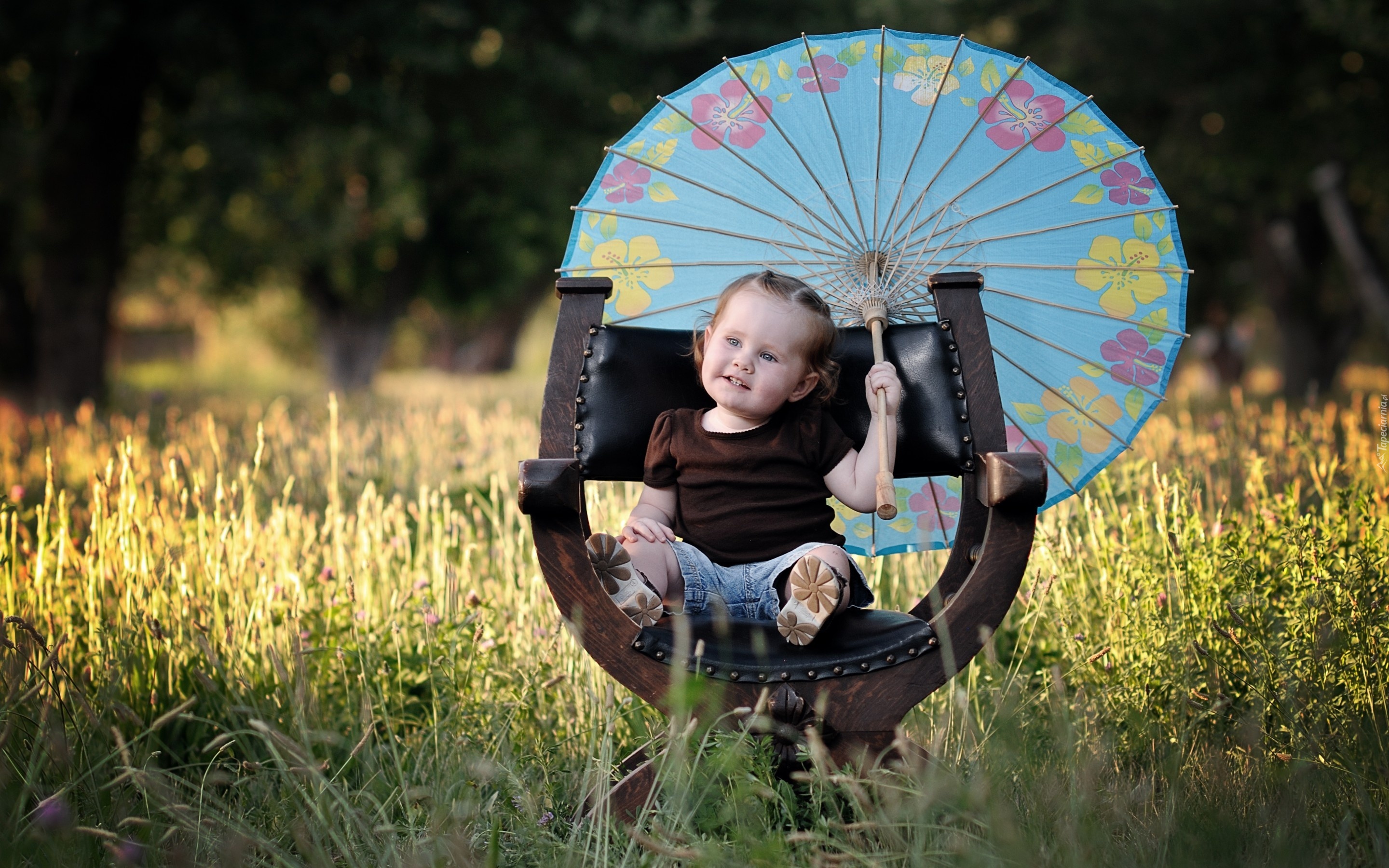 Edytor tapety: Dziewczynka, Fotel, Parasol, Trawa