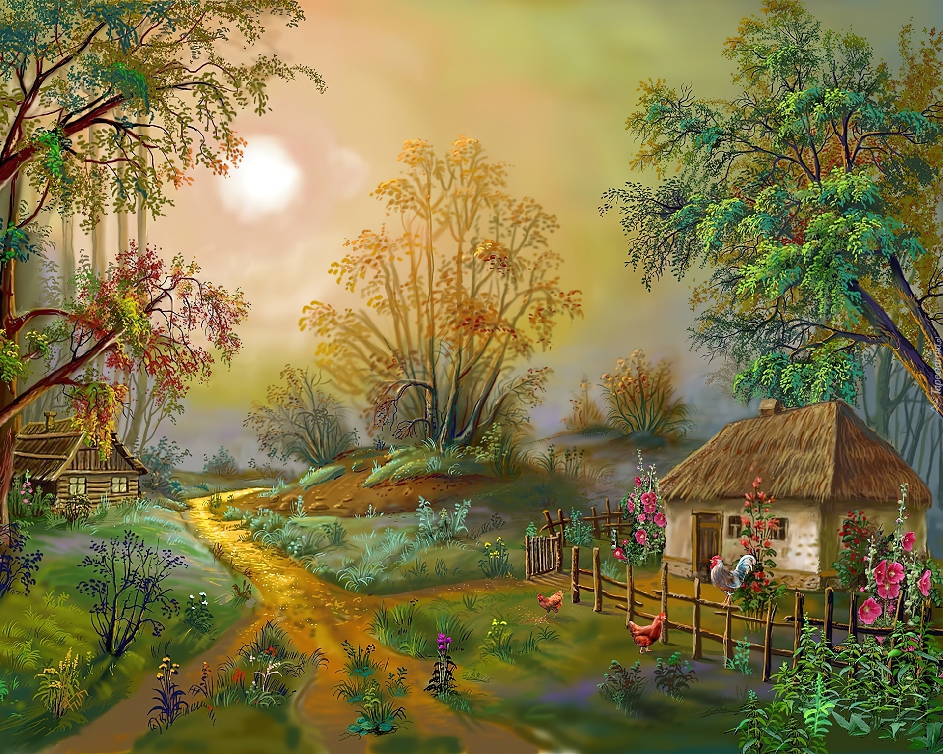 Edytor tapety: Domki, Droga, Kwiaty