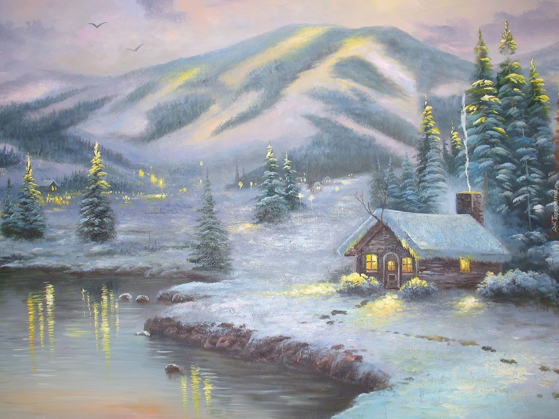 Edytor tapety: Domek, Jezioro, Góry, Zima