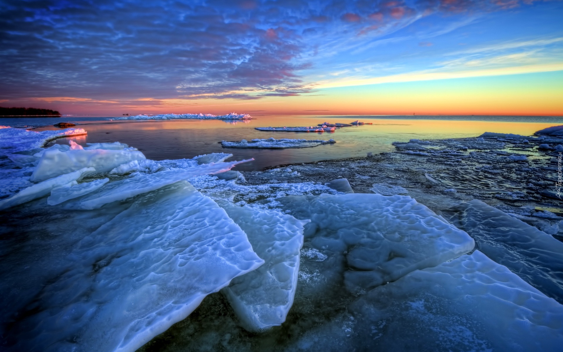 Edytor tapety: Zachód Słońca, Kry, Zima, Morze, Niebo