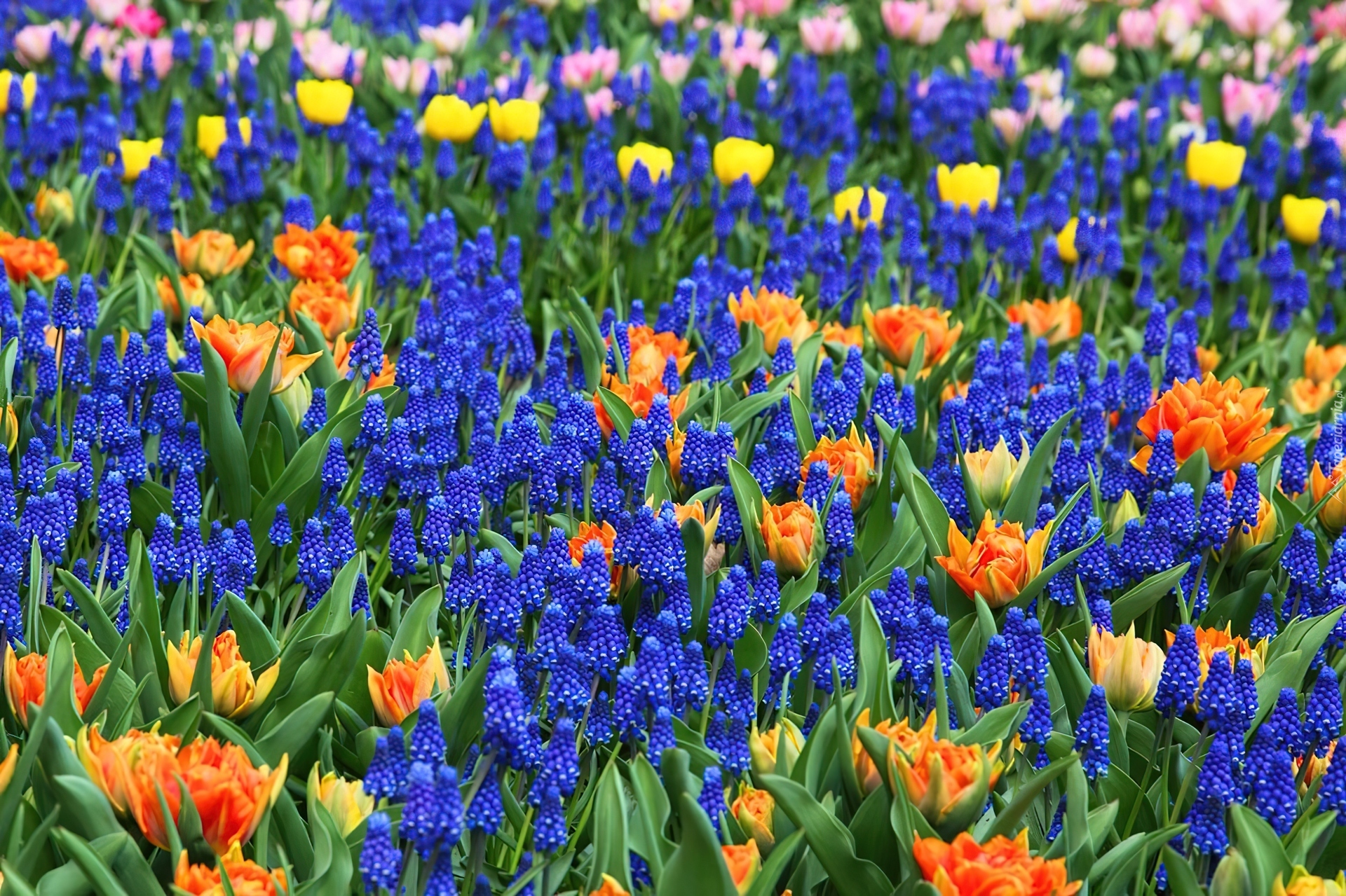 Edytor tapety: Kolorowe, Kwiaty, Tulipany, Szafirki
