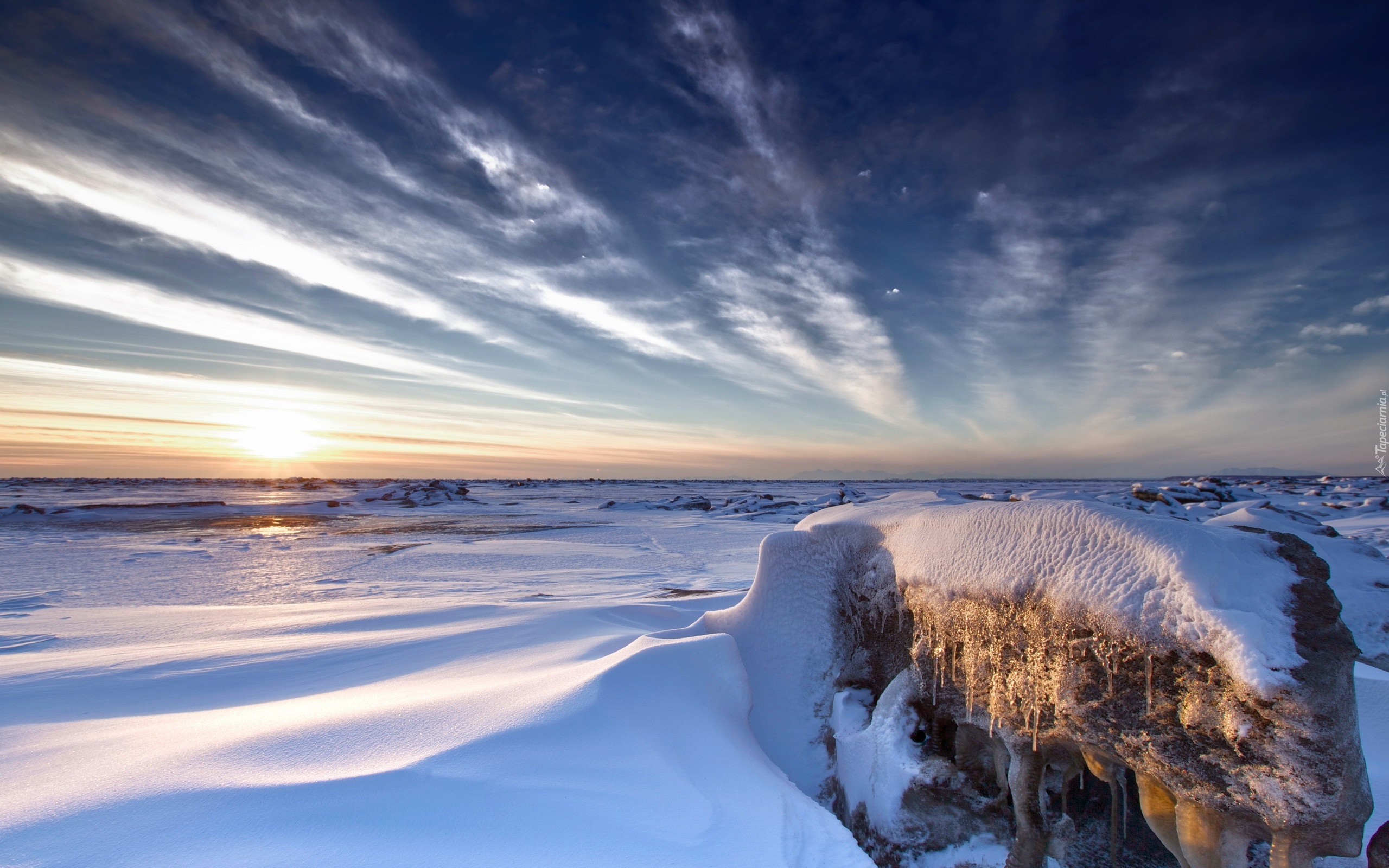 Edytor tapety: Zachód, Słońca, Skałka, Śnieg, Zima