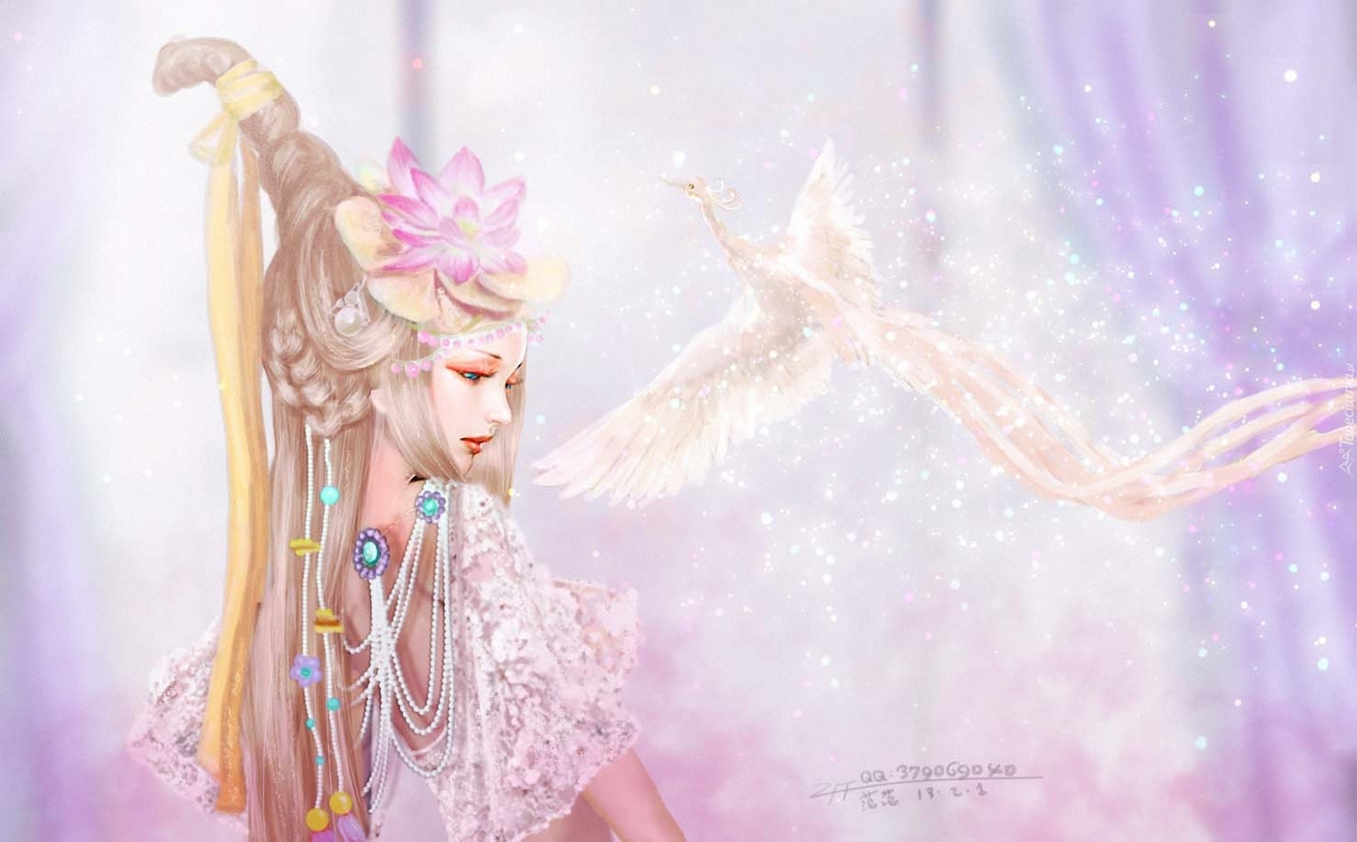 Edytor tapety: Kobieta, Perły, Biały, Ptak