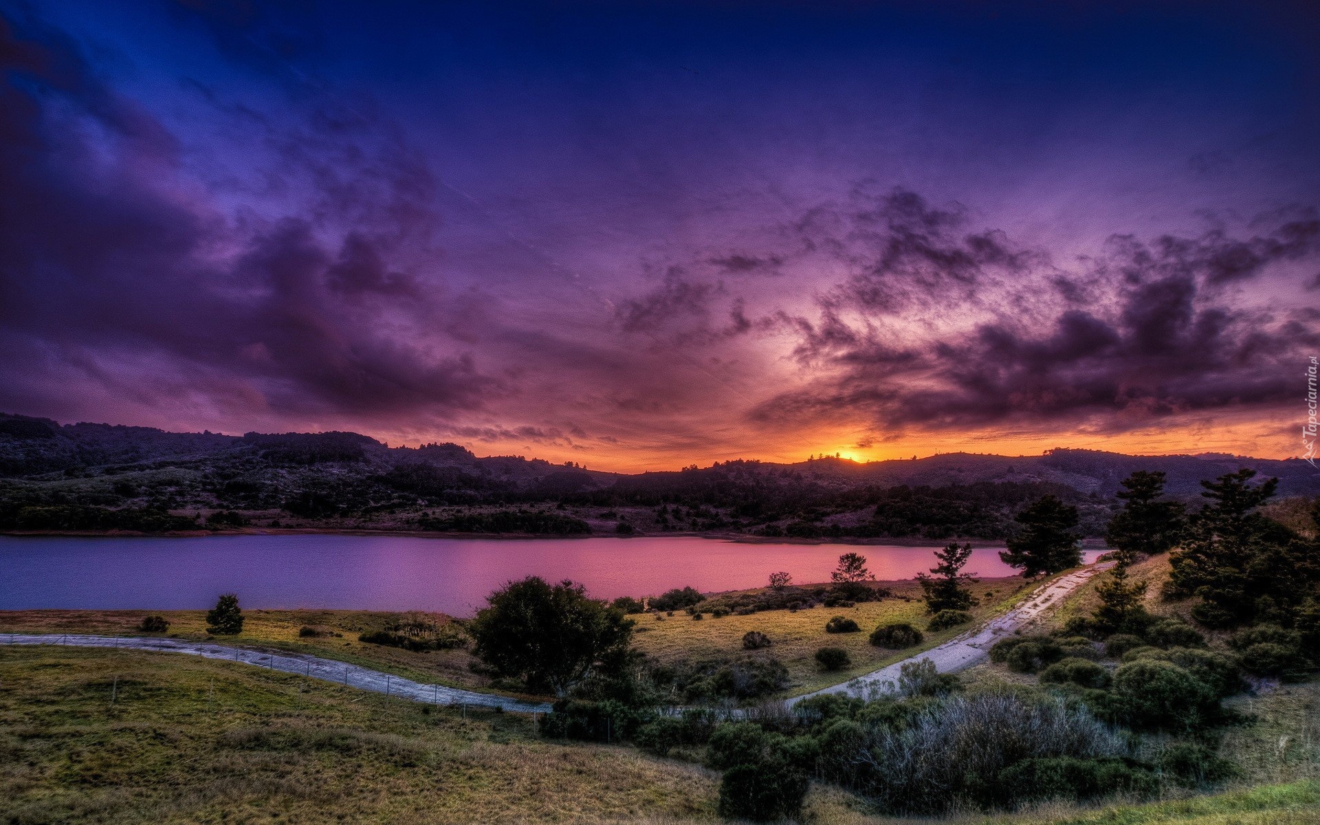 Edytor tapety: Zachód, Słońca, Droga, Jezioro, Lasy