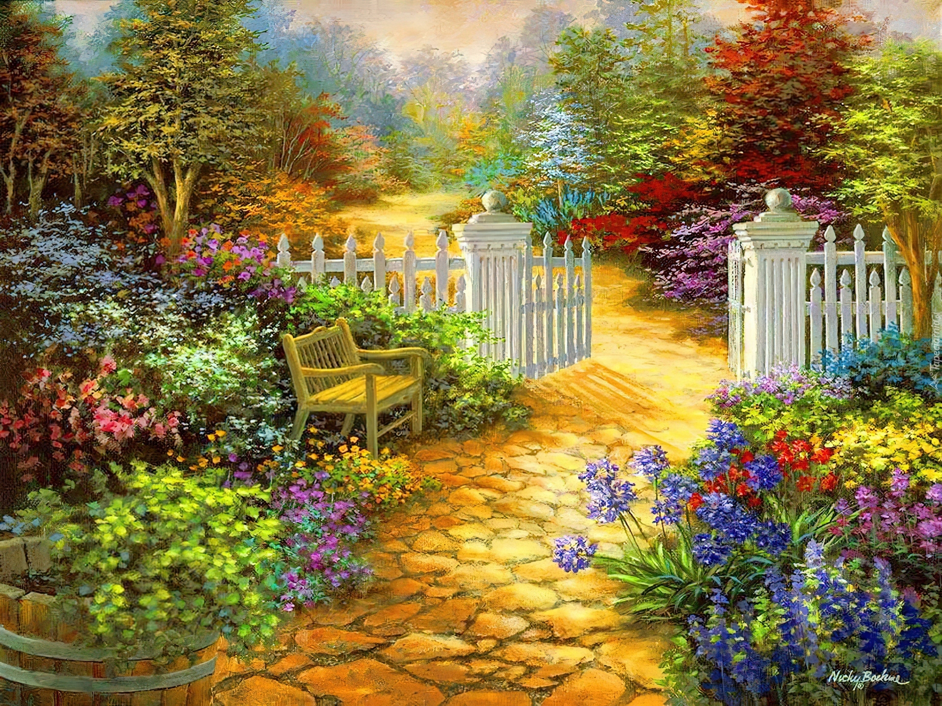 Edytor tapety: Ogród, Płotek, Furtka, Ławka, Kwiaty