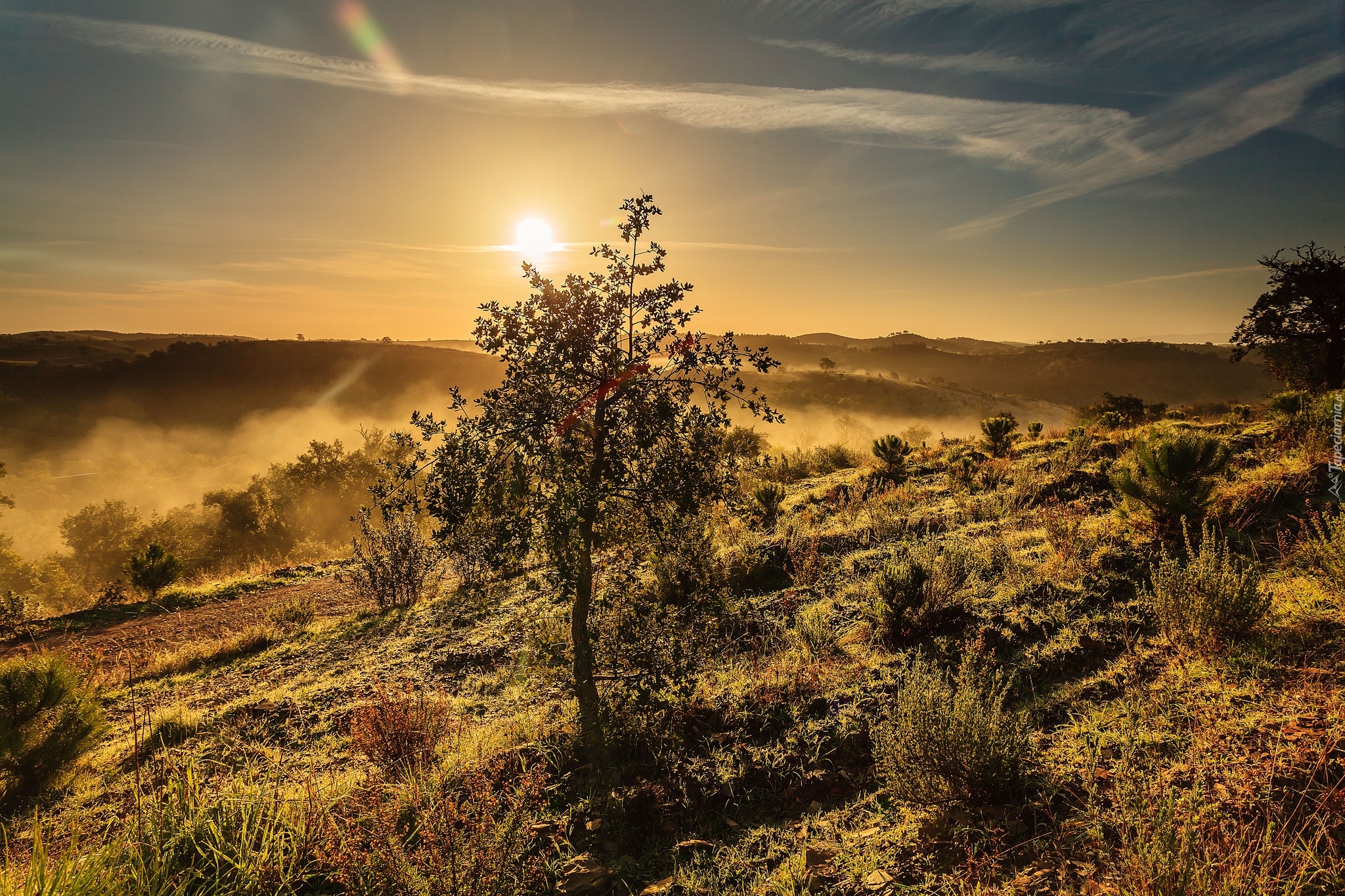 Edytor tapety: Zachód, Słońca, Mgła, Trawa, Drzewo