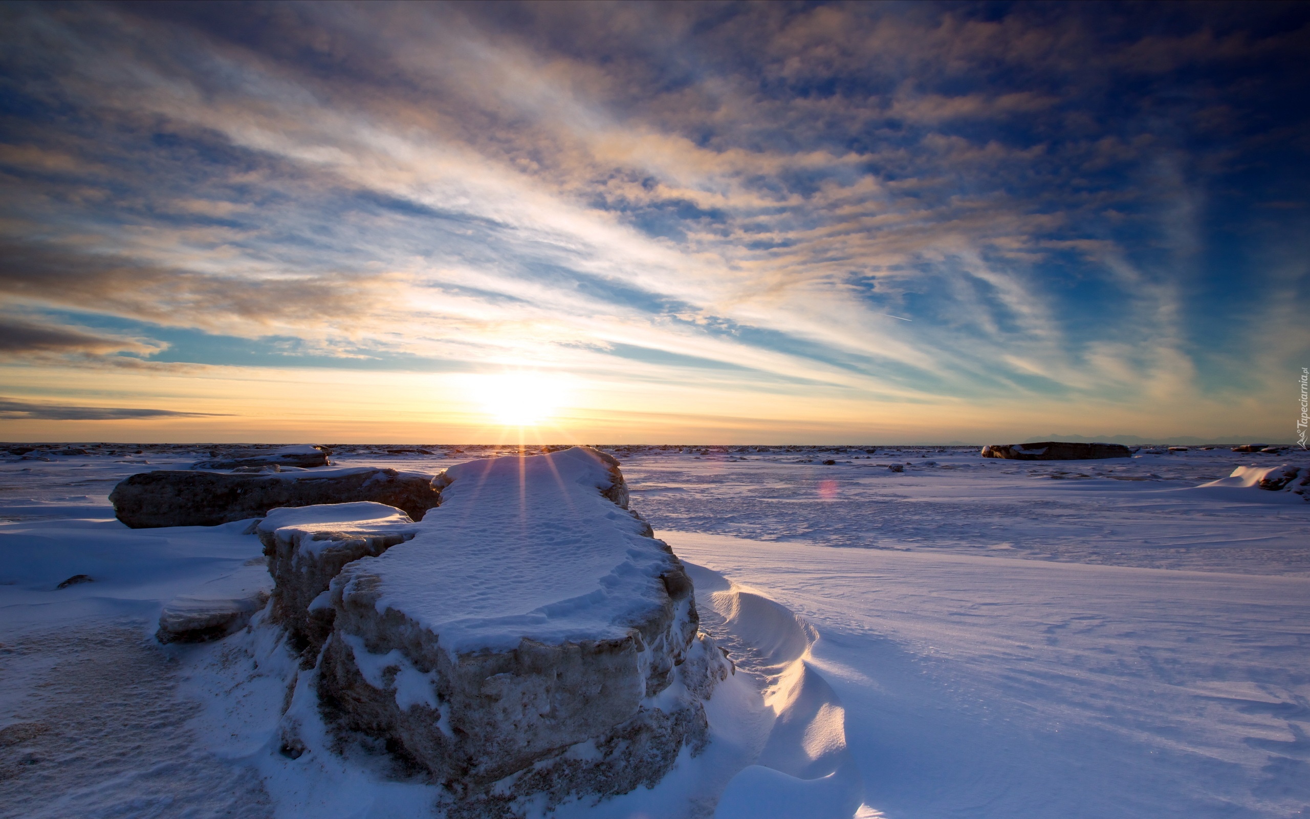 Edytor tapety: Zachód, Słońca, Skałki, Śnieg, Zima