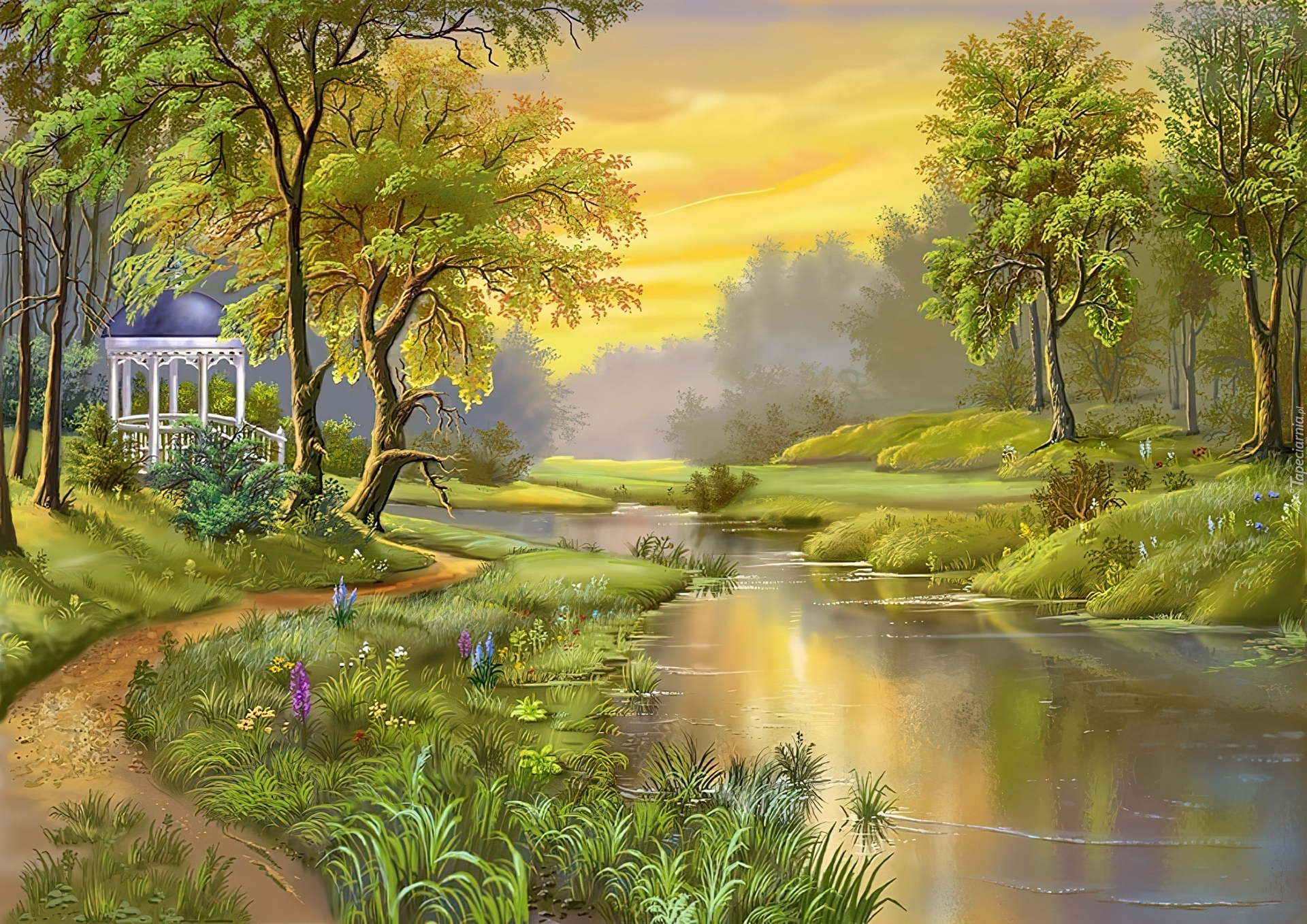 Edytor tapety: Rzeka, Dróżka, Altana, Drzewa