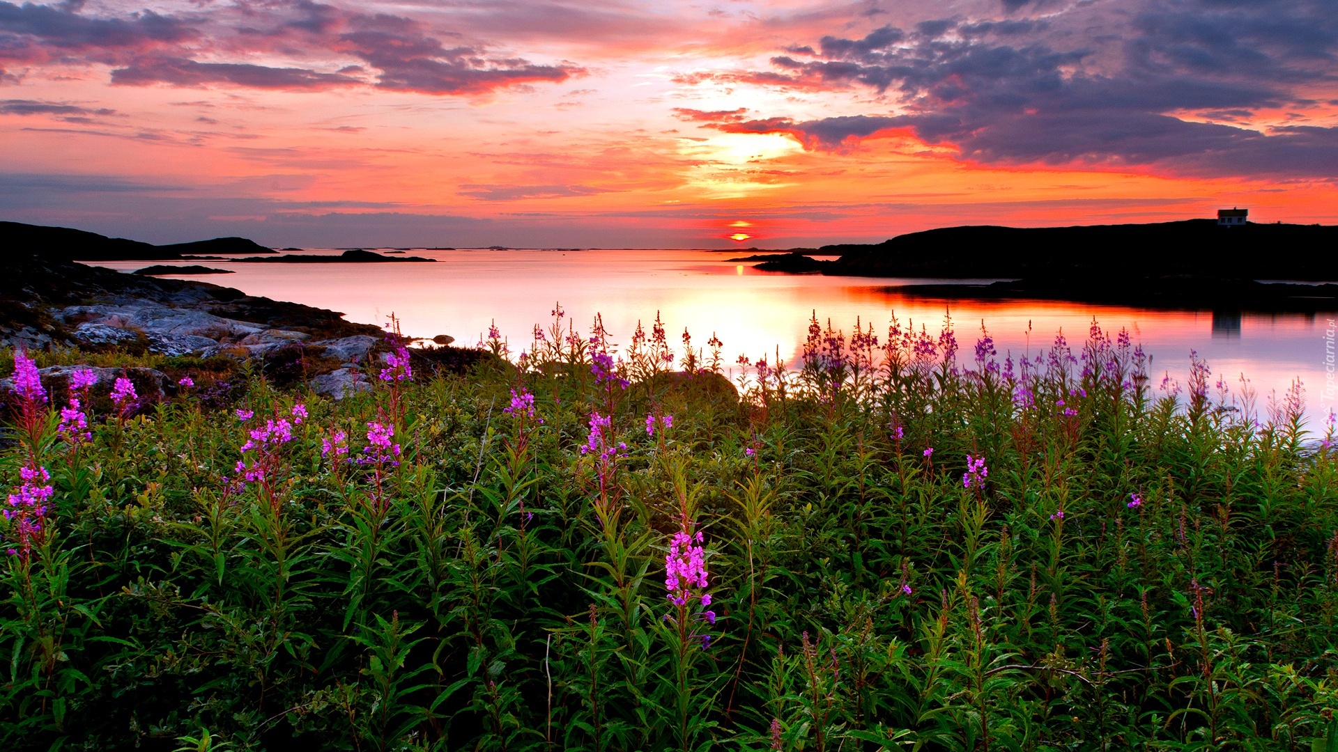 Edytor tapety: Jezioro, Zachód, Słońca, Wybrzeże, Kwiaty