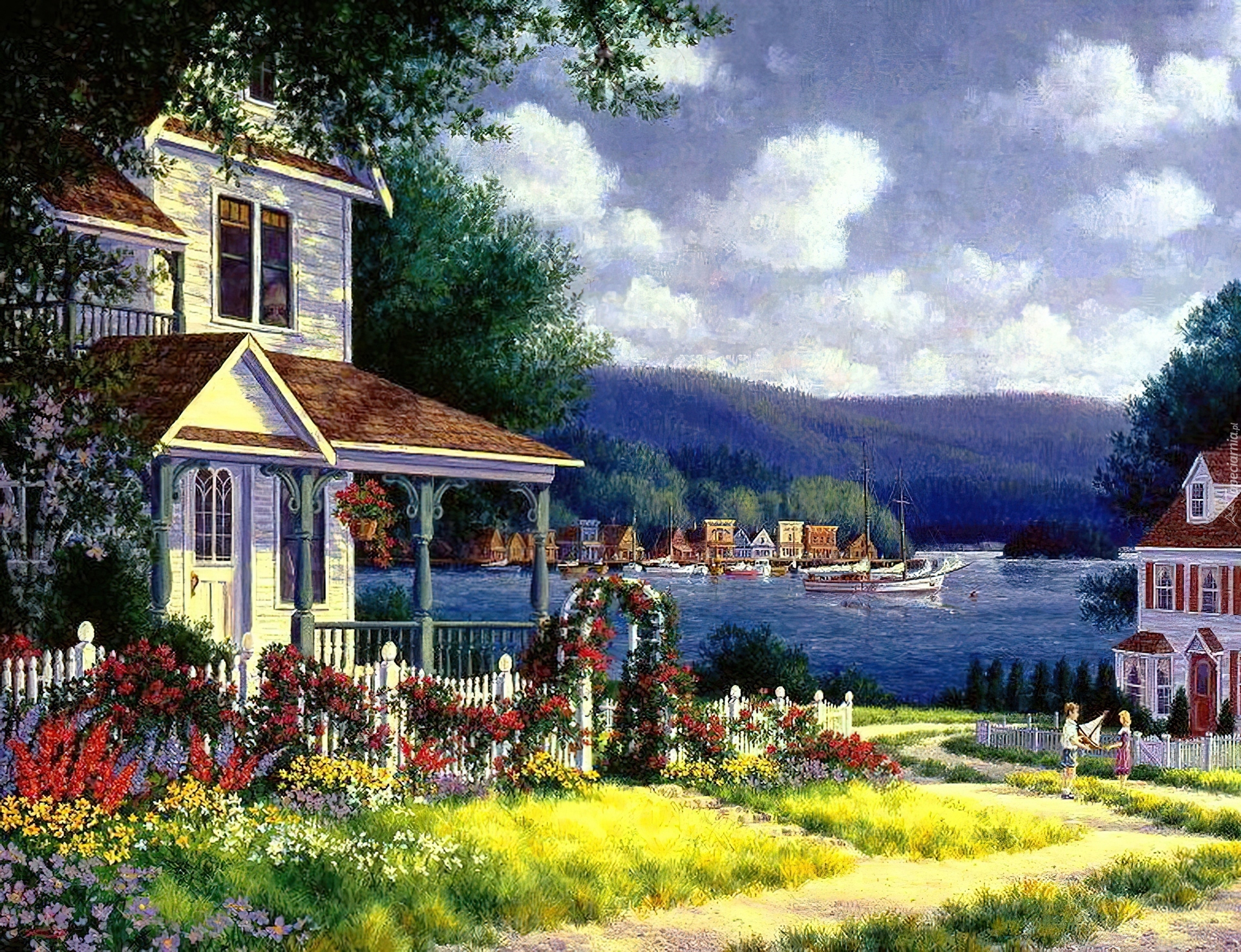 Edytor tapety: Domy, Jezioro, Bawiące, Się, Dzieci