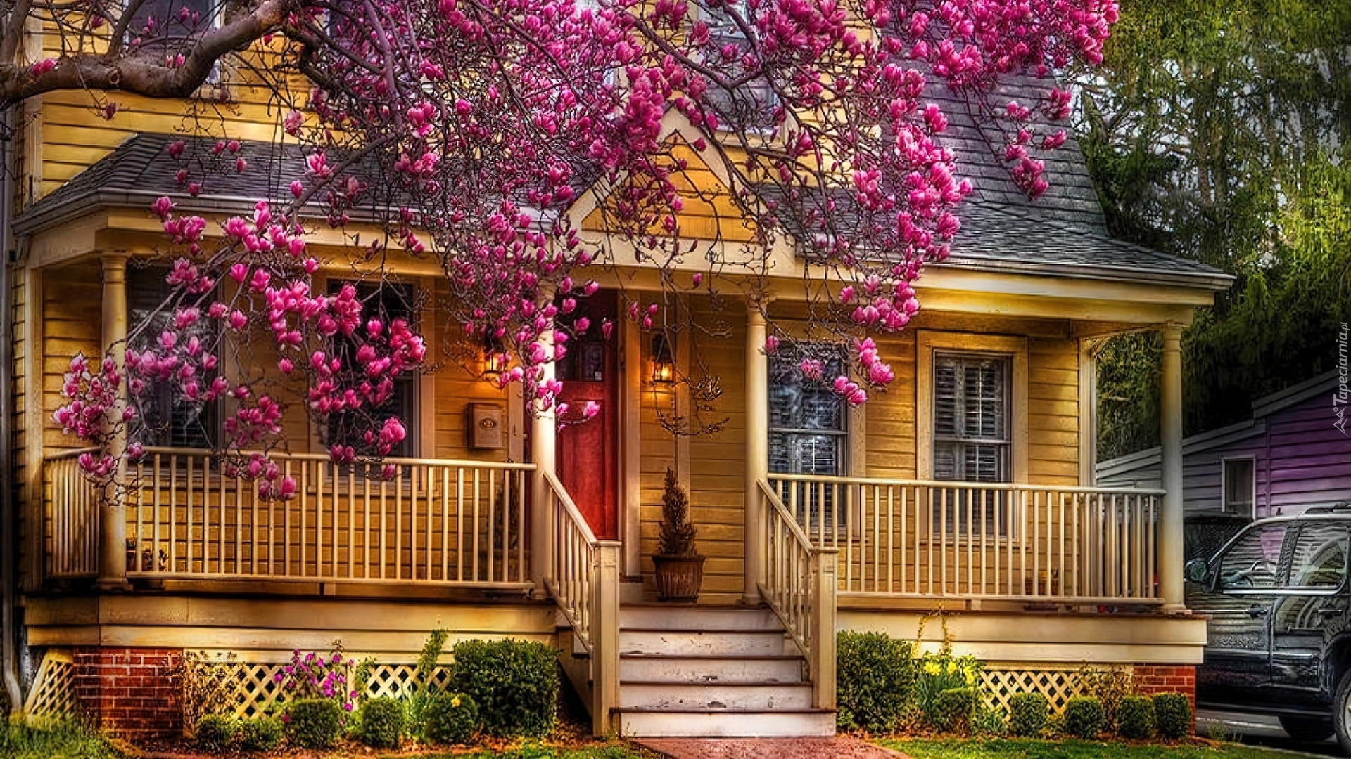 Edytor tapety: Dom, Schodki, Kwitnące, Drzewo, Wiosna
