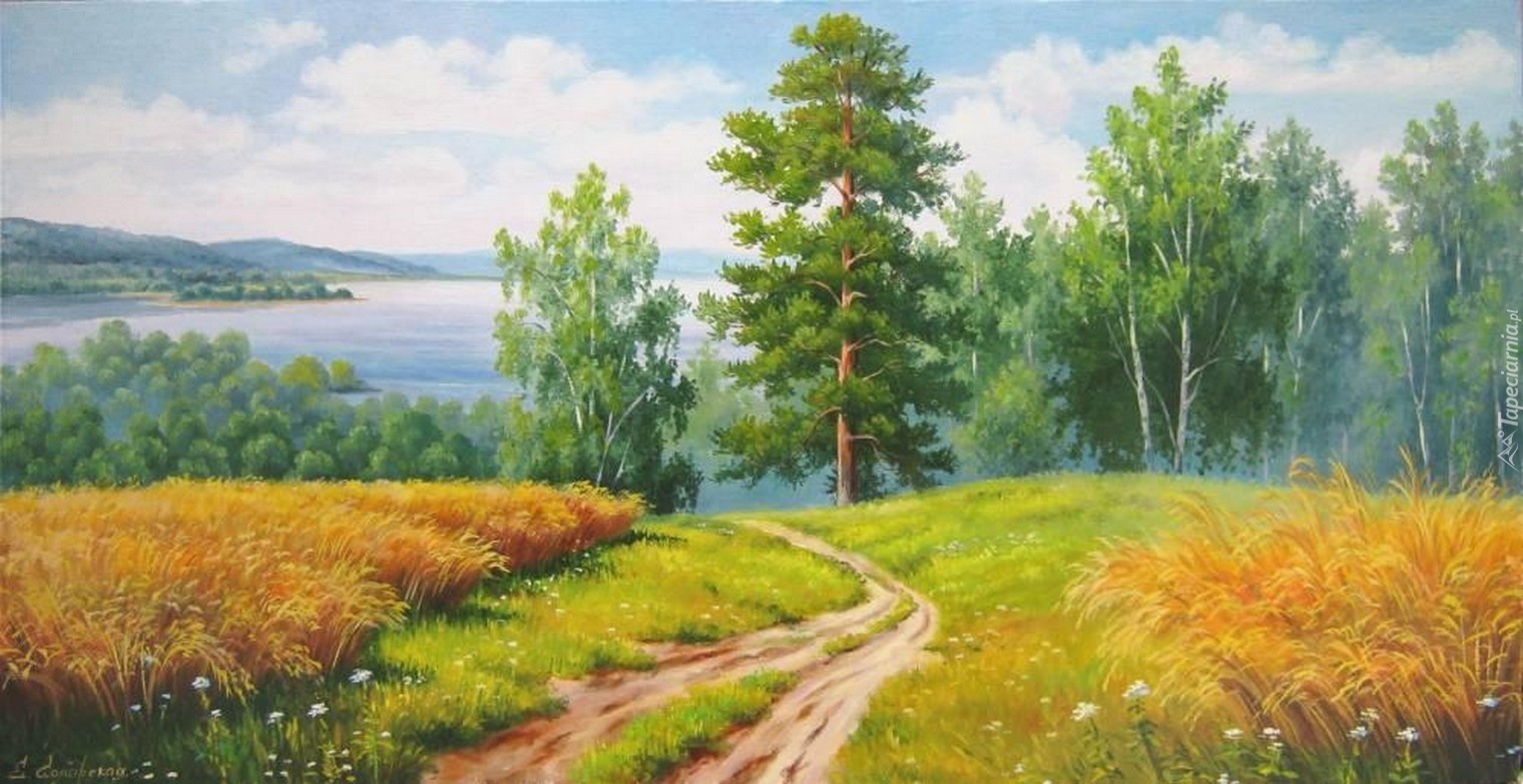 Edytor tapety: Polna, Droga, Zboże, Drzewa, Jezioro