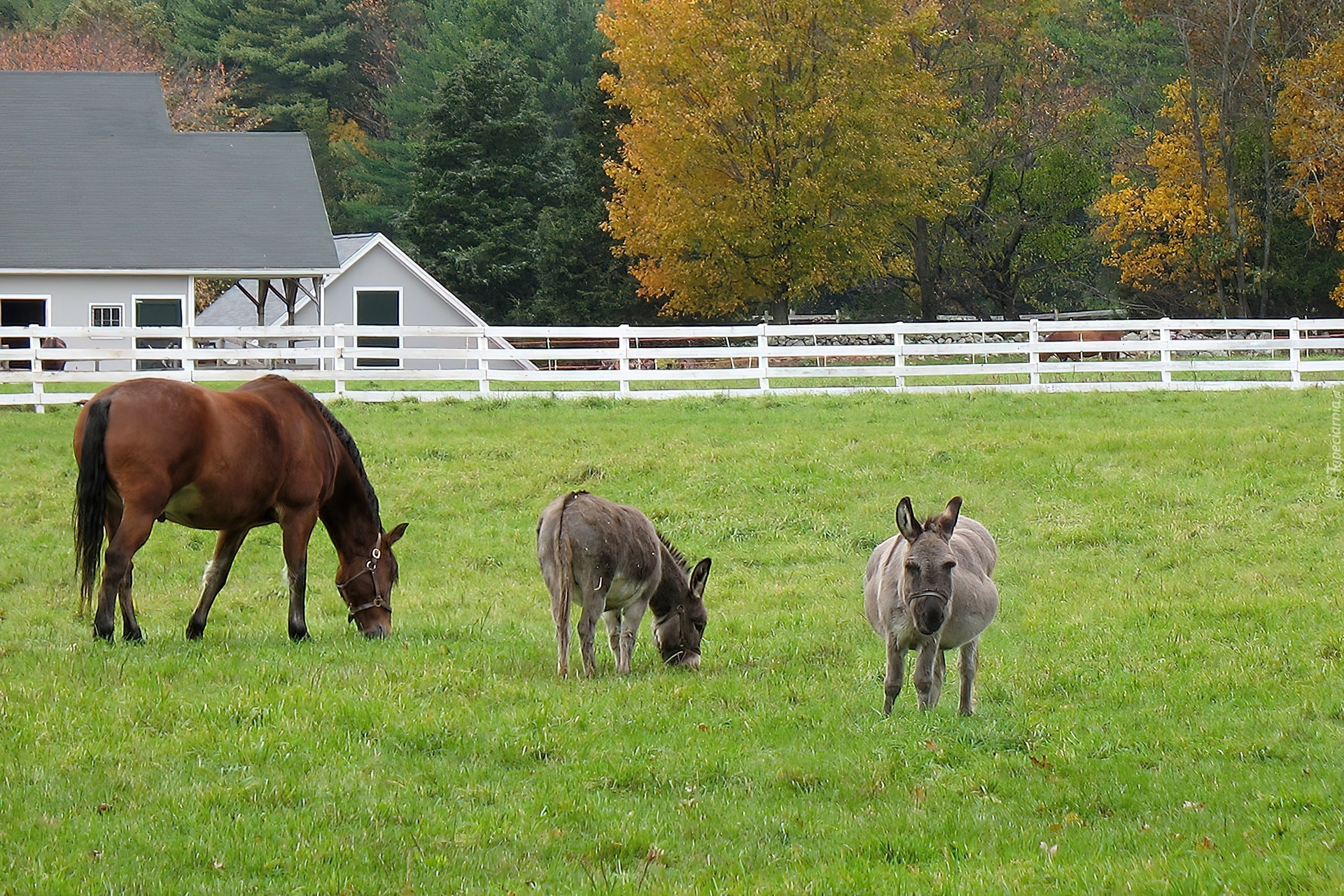 Edytor tapety: Koń, Dwa, Osiołki, Łąka, Zagroda, Drzewa