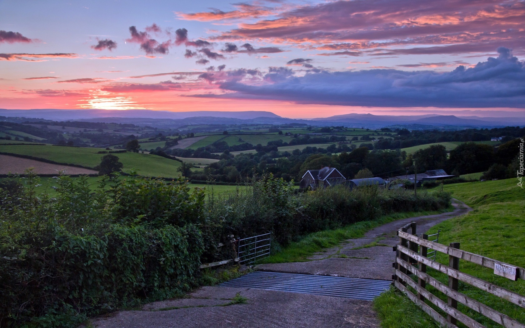 Edytor tapety: Pola, Domy, Droga, Zachód, Słońca