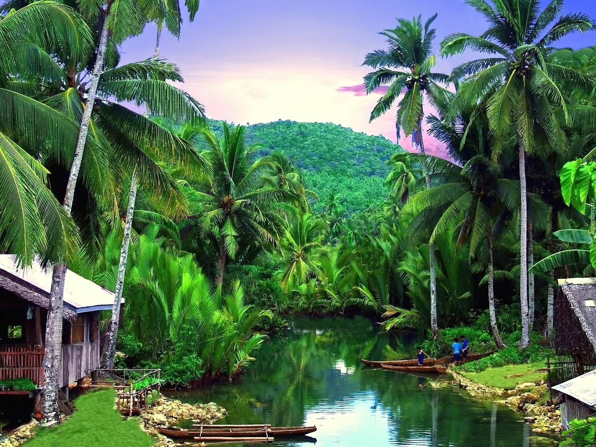 Edytor tapety: Rzeka, Łodzie, Góry, Palmy