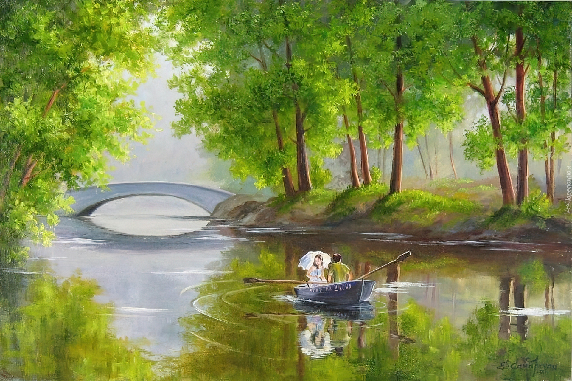 Edytor tapety: Jezioro, Mostek, Drzewa, Łódka, Para