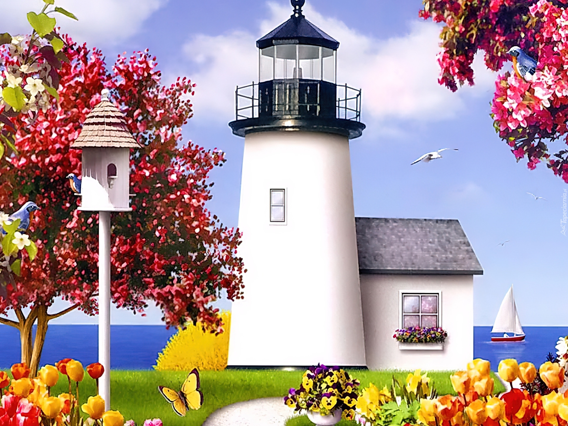 Edytor tapety: Latarnia, Morska, Karmik, Morze, Kwitnące, Drzewa