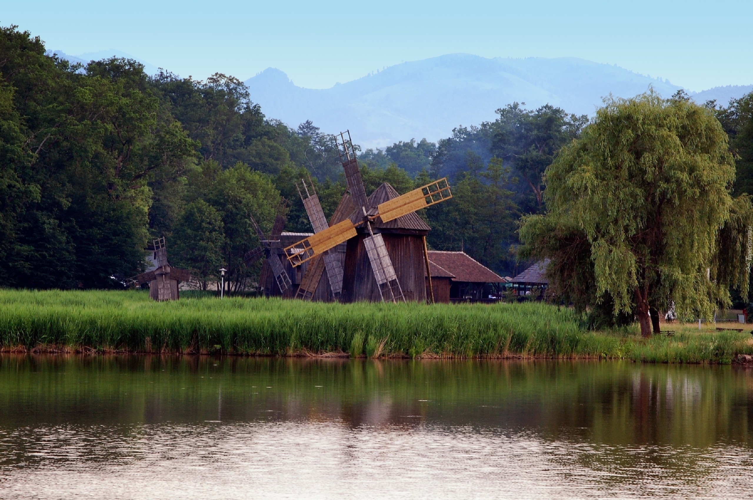 Edytor tapety: Rzeka, Drzewa, Trawy, Wiatraki
